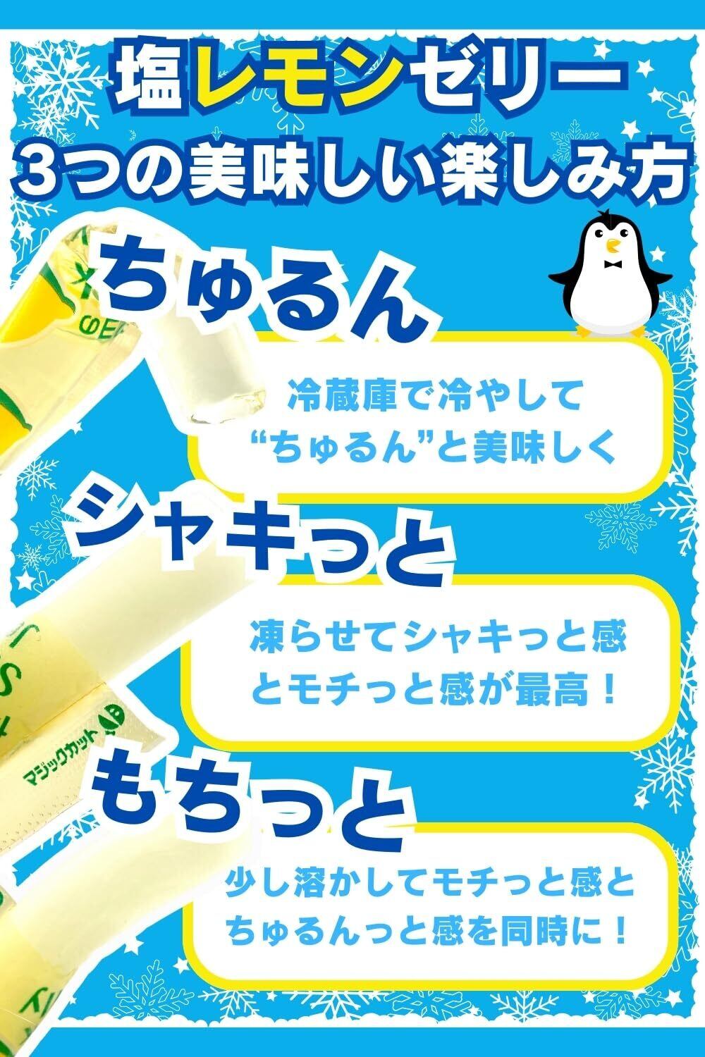 【暑い夏に塩分を!】塩レモン味のスティックゼリータイプです。暑い日に失われやすい塩分をすっきりしたレモン味でお手軽に楽しめる商品です。