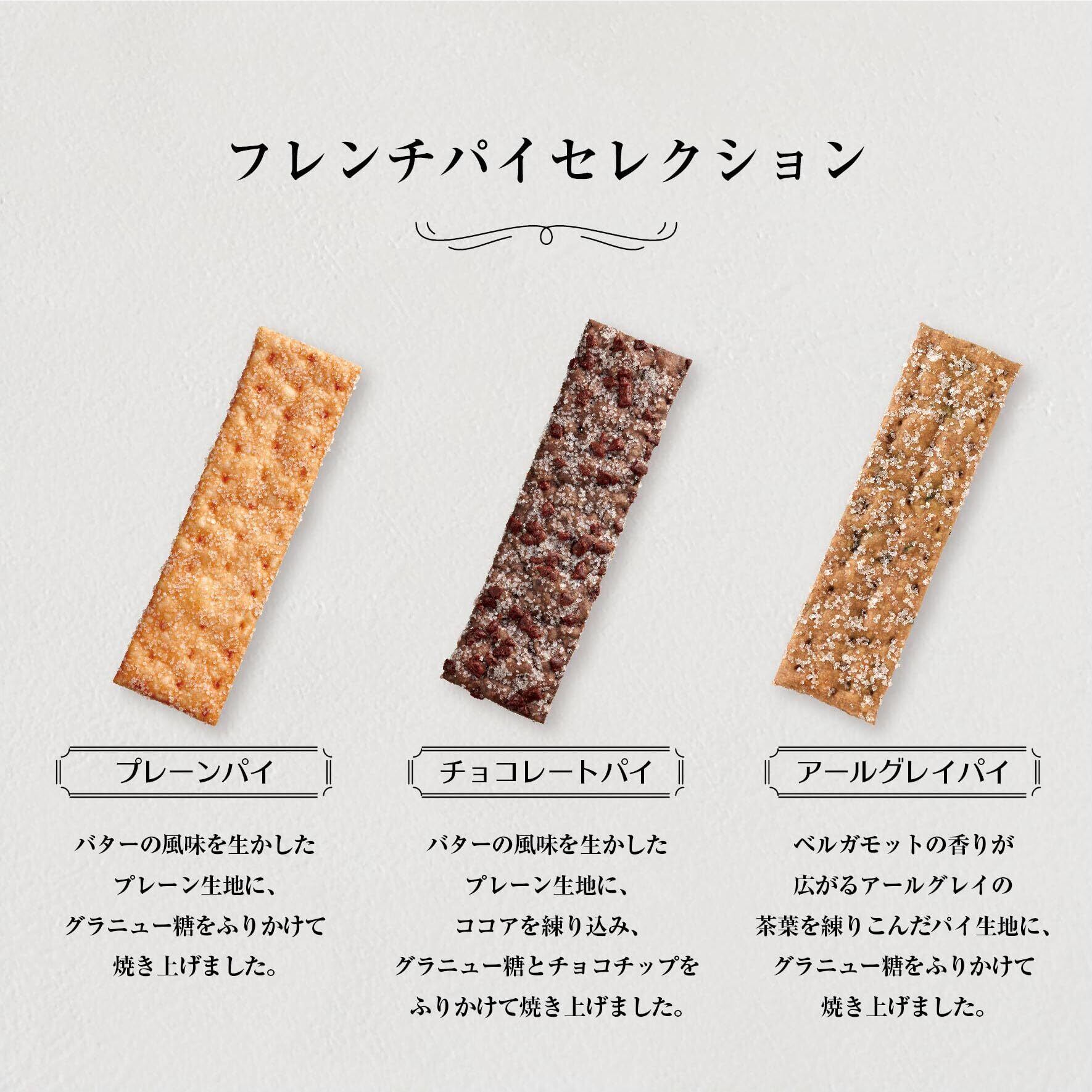 フレッシュバターをたっぷり使用した生地を幾層にも重ね、一枚一枚丁寧に焼き上げました。プレーン、チョコレート、アールグレイ、3種類の味わいとサクッとした食感をお楽しみください。(注)「が発送」の場合、【包装紙あり】【手提げ袋なし】になります。