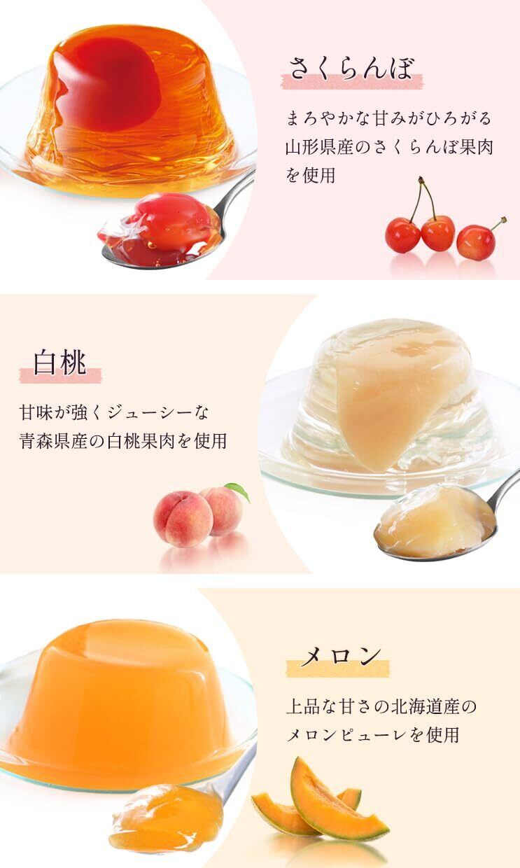 果実の旨味をそのまま生かして作られたこのゼリーは、口どけが良く、豊かなフルーツの風味を感じられます。特別なイベントやお祝いの場に、さりげないお心遣いとしてお使いいただけるでしょう。また、夏の暑い日やおやつの時間に、さっぱりとした味わいのデザートとしてもぴったりです!