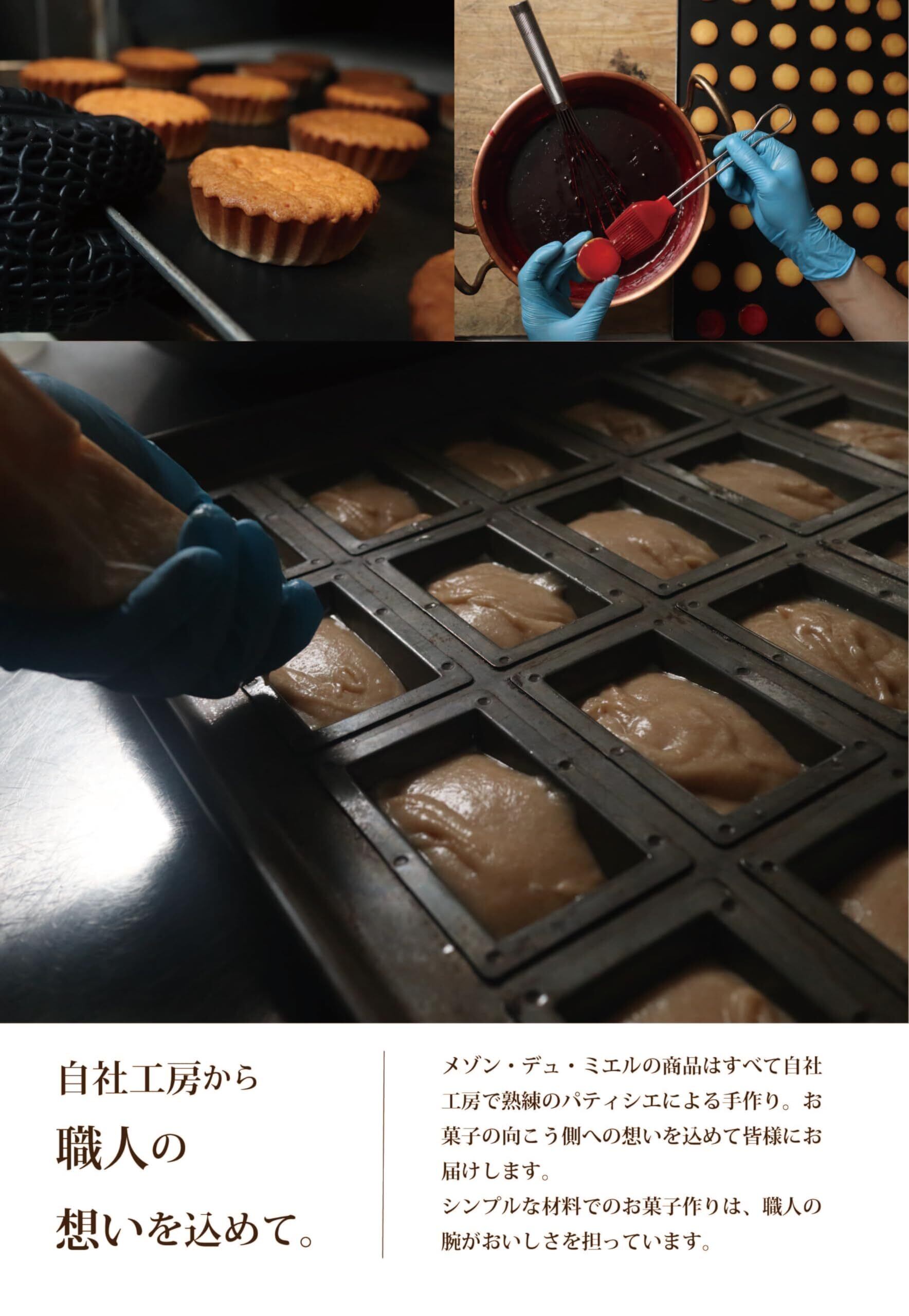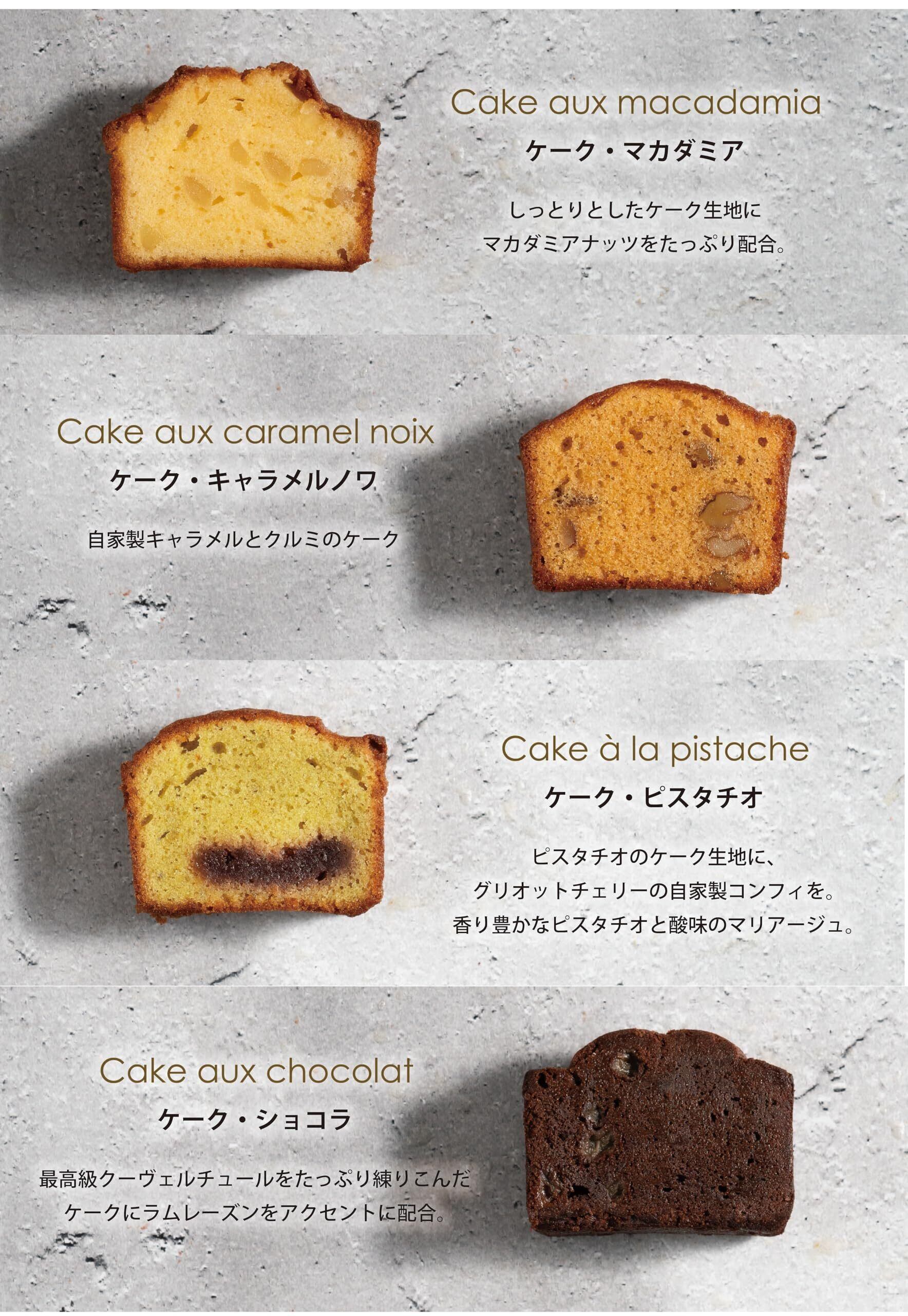原材料名・・・原材料名・・・【マドレーヌ】卵、バター、小麦粉、砂糖、はちみつ(岐阜県産)、ごま油、レモン果皮/ベーキングパウダー 【フィナンシェ】バター、卵、砂糖、アーモンド、小麦粉、はちみつ(岐阜県産)/ベーキングパウダー 【フィナンシェ・ピスターシュ】バター、卵、砂糖、アーモンド、ピスタチオパウダー、ピスタチオペースト、小麦粉、はちみつ(岐阜県産)/ベーキングパウダー 【ケーク・ピスタチオ】砂糖、卵、バター、小麦粉、グリオットチェリー、ピスタチオパウダー、ピスタチオペースト、マジパンローマッセ/ベーキングパウダー 【ケーク・ショコラ】卵、レーズン、チョコレート、砂糖、バター小麦粉、アーモンド、ココア、洋酒/ベーキングパウダー【ケーク・マカダミア】砂糖、卵、バター、小麦粉、マカダミア、マジパンローマッセ、ココナッツ/ベーキングパウダー、【ケーク・キャラメル・ノワ】卵、砂糖、バター、小麦粉、マジパンローマッセ、くるみ、生クリーム/ベーキングパウダー【赤い実のサブレ】小麦粉、バター、砂糖、フランボワーズ、卵、塩/ペクチン(リンゴ由来)、酸味料【サブレ・オ・ショコラ】砂糖、小麦粉、バター、チョコレート、カカオパウダー、卵黄、重曹、塩【メープル・フォルテ】小麦粉)、バター、グラニュー糖、メープルシュガー、卵、塩