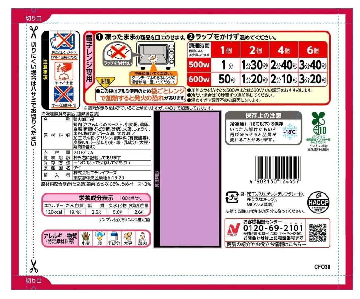 鶏肉(ささみ)、うめペースト、小麦粉、鶏卵、食塩、糖類(ぶどう糖、砂糖)、大葉、しょうゆ、米粉、揚げ油(パーム油、大豆油)/加工でん粉、グリシン、調味料(有機酸等)、炭酸Na、(一部に小麦・卵・乳成分・大豆・鶏肉を含む)