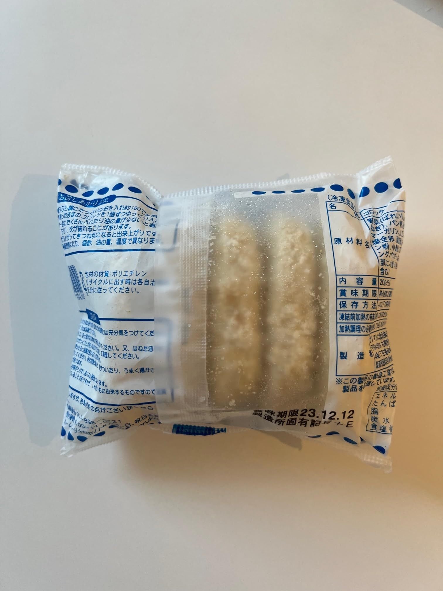 野菜{ばれいしょ(北海道)、たまねぎ}、パン粉、砂糖、脱脂粉乳、マーガリン、加工油脂、食塩、乾燥全卵、醸造酢、香辛料、衣(パン粉、小麦粉、でん粉)/ベーキングパウダー、増粘多糖類、(一部に小麦・卵・乳成分・大豆を含む)