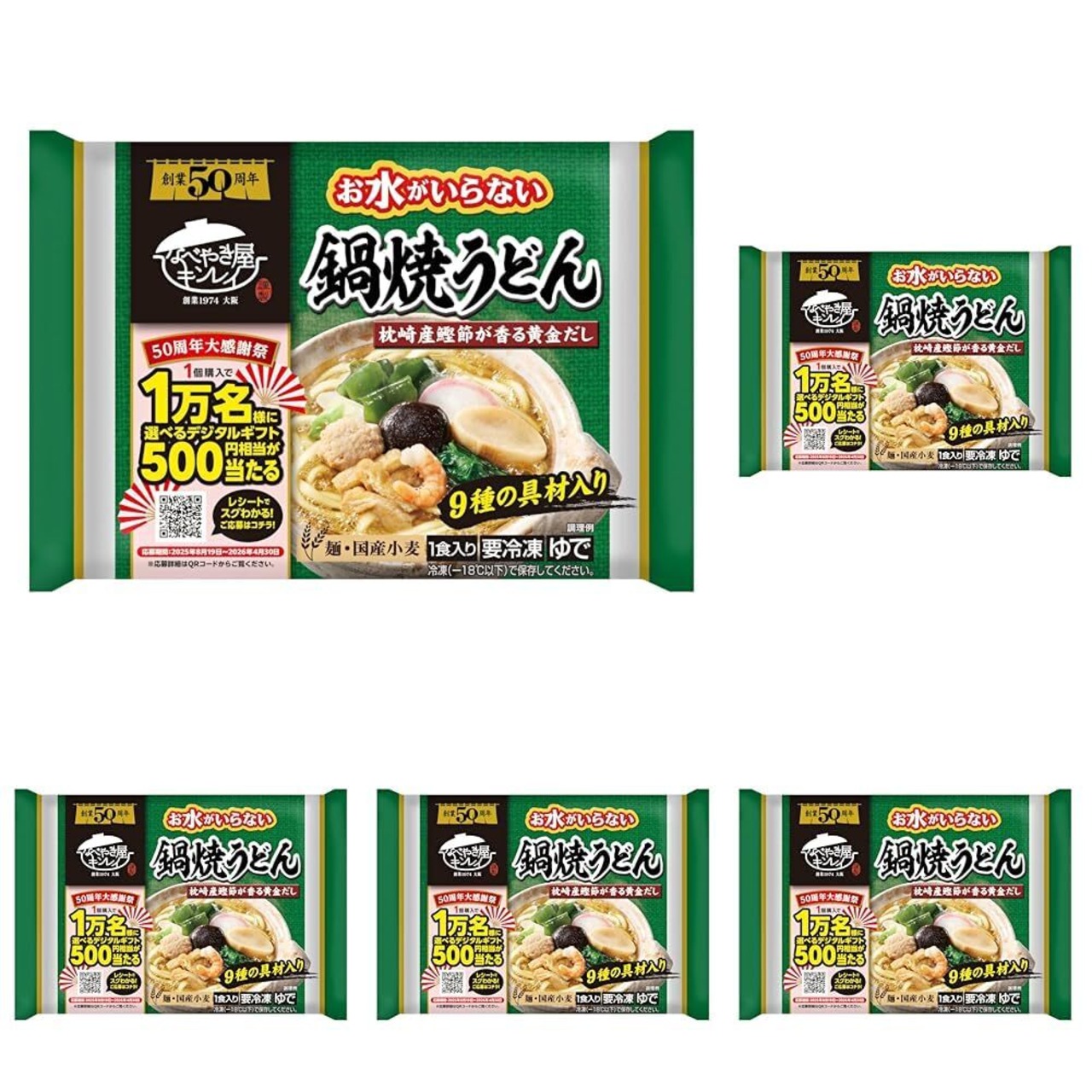 「キンレイ お水がいらない鍋焼うどん」は、手間いらずで本格的な鍋焼うどんを楽しめる冷凍食品です!1食分を5パックセットでお届け。おいしい出汁がたっぷりのスープと、モチモチのうどんが絡み合い、心も体も温まります。忙しい日々のディナーやランチにもぴったりな手軽さです。