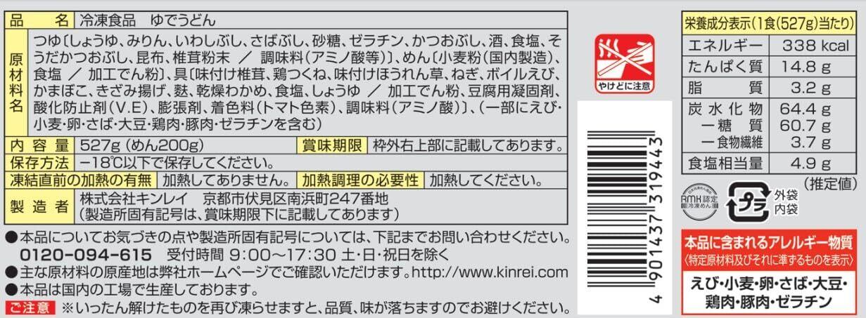 つゆ〔しょうゆ、みりん、いわしぶし、さばぶし、砂糖、ゼラチン、かつおぶし、酒、食塩、そうだかつおぶし、昆布、椎茸粉末 / 調味料(アミノ酸等)〕、めん〔小麦粉(国内製造)、食塩 / 加工でん粉〕、具〔味付け椎茸、鶏つくね、味付けほうれん草、ねぎ、ボイルえび、かまぼこ、きざみ揚げ、麩、乾燥わかめ、食塩、しょうゆ / 加工でん粉、豆腐用凝固剤、酸化防止剤(V.E)、膨張剤、着色料(トマト色素)、調味料(アミノ酸)〕、(一部にえび・小麦・卵・さば・大豆・鶏肉・豚肉・ゼラチンを含む)