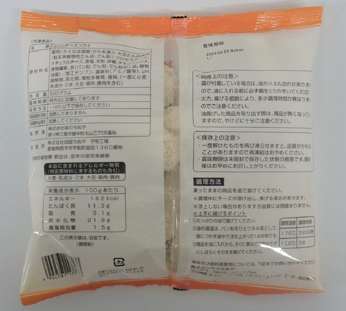 鶏肉(タイ又は国産(5%未満))、大豆たん白食品(粉末状植物性たん白、でん粉)、プロセスチーズ、ナチュラルチーズ、食塩、米粉、砂糖、チキンコンソメ、食物繊維、衣(パン粉、でん粉、でん粉加工品、植物油脂)/加工デンプン、調味料(アミノ酸等)、pH調整剤、乳化剤、増粘多糖類、香料、(一部に小麦・乳成分・ごま・大豆・鶏肉・豚肉を含む)