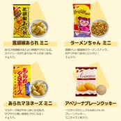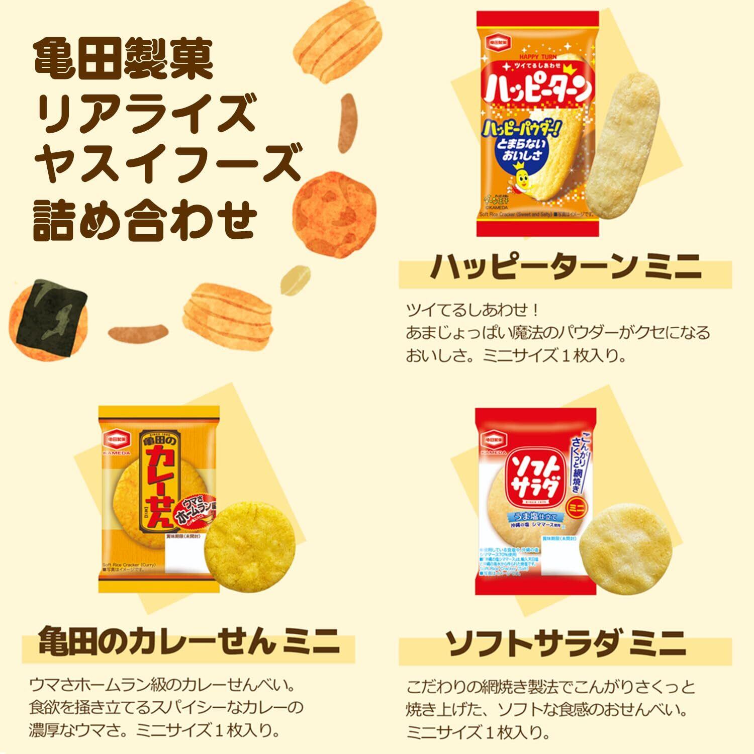 【セット内容】ハッピーターン(4g)20個、亀田のカレーせん(2.7g)20個、ソフトサラダ(2.6g)20個、柿の種(9g)5個、ペヤングやきそばソースカツ(1個入)5個、揚一番(1枚)5個、ぽたぽた焼き(1枚)5個、黒胡椒あられ(4g)5個、あられマヨネーズ(4g)5個、ラーメンちゃん(5g)5個、アベリーナプレーンクッキー(1枚)5個