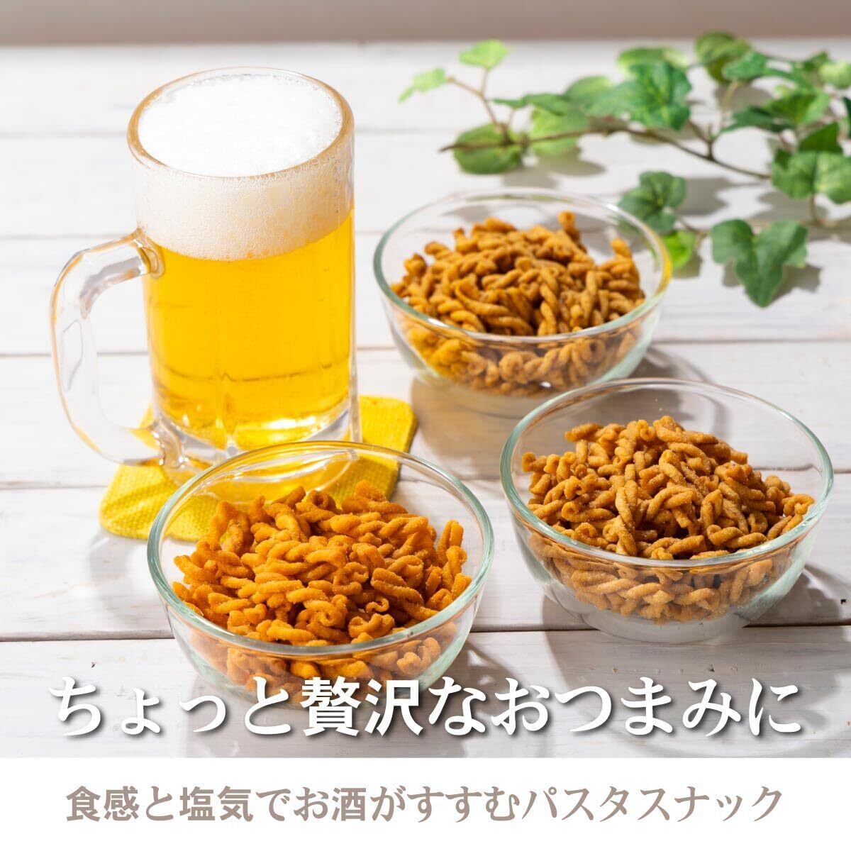 このパスタスナックは、厳選された原材料を使用し、さまざまな味付けにこだわることで、飽きが来ない美味しさを実現しています。パスタ本来の風味が活かされ、手軽に本格的な味わいが楽しめるのが特徴です。お酒のおつまみにも最適で、ついつい手が伸びてしまう美味しさです。