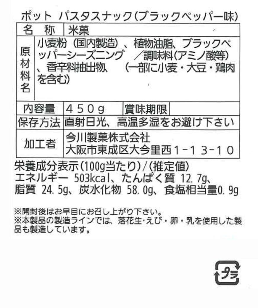 「今川製菓 ポット パスタスナック ブラックペッパー味」は、香ばしいブラックペッパーがアクセントのパスタスナックです!450gの大容量パックで、家族や友人と一緒にシェアしながら楽しむのに最適な商品です♪