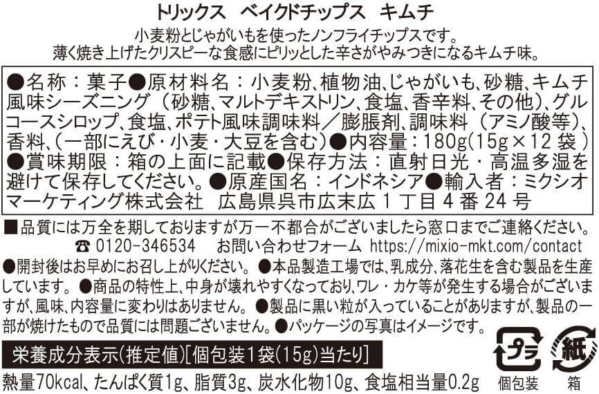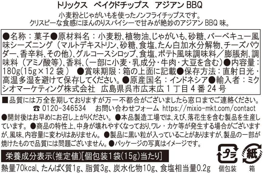 【オリジナル】ヘルシーなのに、クセになる。薄く焼き上げたクリスピーなベイクドチップスです。 小麦粉とジャガイモを使ったノンフライチップスで、インドネシア全土で販売されています。クリスピーな食感とじゃがいもの風味が楽しめる秘伝調味料のオリジナル味。しょうゆベースで現地の定番人気フレーバーです。【アジアンBBQ】薄く焼き上げたクリスピーなベイクドチップスです。 小麦粉とジャガイモを使ったノンフライチップスで、インドネシア全土で販売されています。クリスピーな食感にほんのりスパイシーで甘みが絶妙のアジアンBBQ味。【キムチ】薄く焼き上げたクリスピーなベイクドチップスです。 小麦粉とジャガイモを使ったノンフライチップスで、インドネシア全土で販売されています。クリスピーな食感とピリッとした辛さがやみつきになるキムチ味。