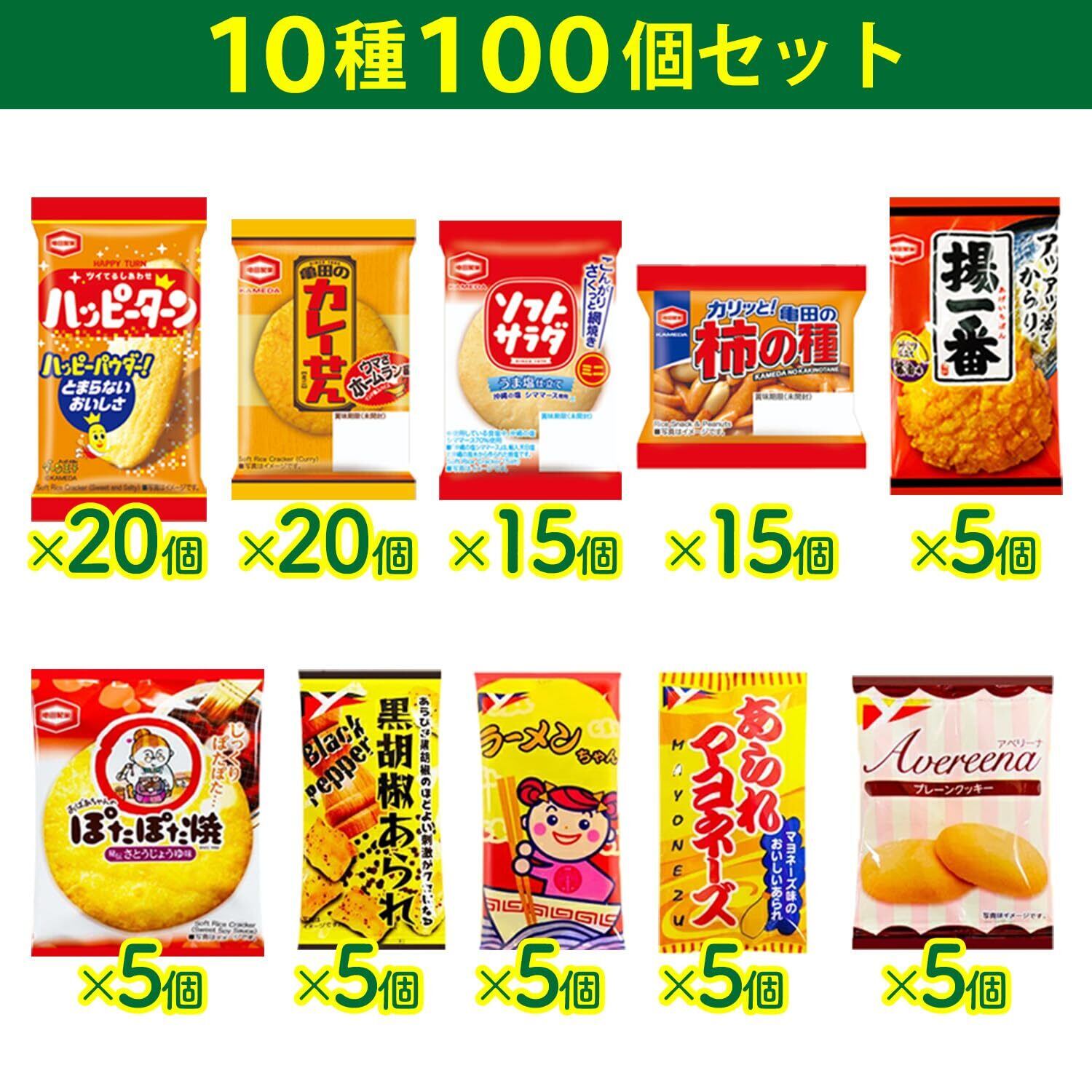 【セット内容】ハッピーターン(4g)20個、亀田のカレーせん(2.7g)20個、ソフトサラダ(2.6g)15個、亀田の柿の種 ミニ(9g)15個、揚一番(1枚)5個、ぽたぽた焼き(1枚)5個、黒胡椒あられ(4g)5個、あられマヨネーズ(4g)5個、ラーメンちゃん(5g)5個、アベリーナプレーンクッキー(1枚)5個