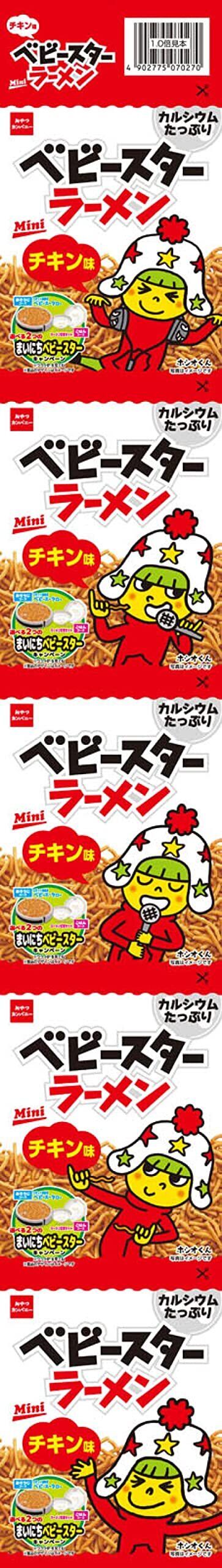 大人気ベビースターラーメンが5袋連なったタイプになります! ! 食べきりサイズのため、小分けにしてお召し上がりいただけます。パリッ、ポリッとした食感のベビースターラーメンのチキン味を存分にお楽しみください。日常のちょっとしたおつまみやお子様へのおやつに最適です! !
