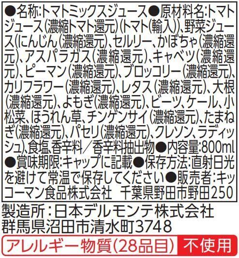 原材料:トマトジュース(濃縮トマト還元)(トマト(輸入))、野菜ジュース(にんじん(濃縮還元)、セルリー、かぼちゃ(濃縮還元)、アスパラガス(濃縮還元)、キャベツ(濃縮還元)、ピーマン(濃縮還元)、ブロッコリー(濃縮還元)、カリフラワー(濃縮還元)、レタス(濃縮還元)、大根(濃縮還元)、よもぎ(濃縮還元)、ビーツ、ケール、小松菜、ほうれん草、チンゲンサイ(濃縮還元)、たまねぎ(濃縮還元)、パセリ(濃縮還元)、クレソン、ラディッシュ)、食塩、香辛料/香辛料抽出物