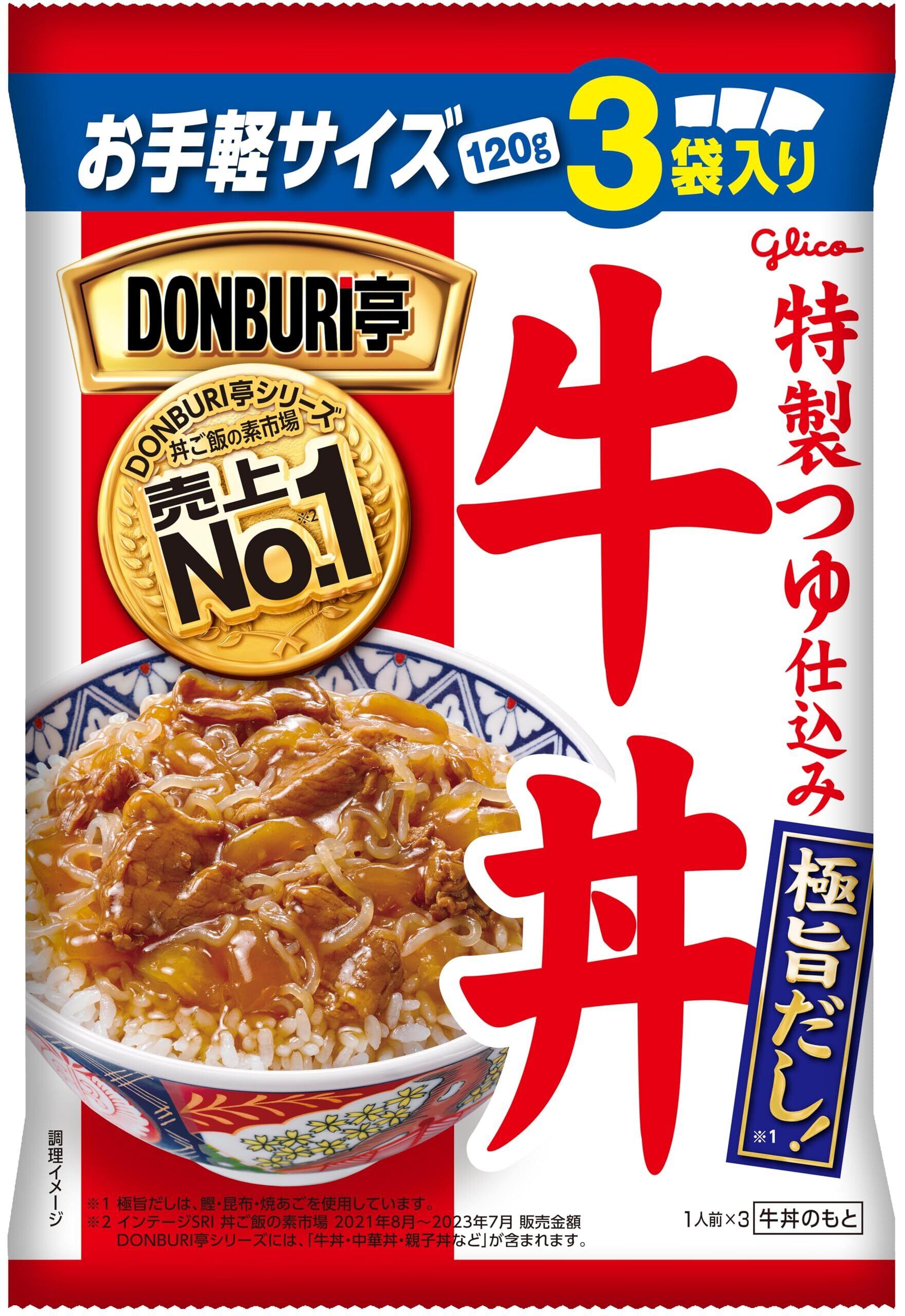 ・グリコの人気レトルト食品<DONBURI亭>シリーズより、買置きに便利な3食パックのご紹介です。・<DONBURI亭シリーズ>は、お湯やレンジで温めるだけで簡単&手軽に食べ応えのあるどんぶりご飯が楽しめるレトルトどんぶりのもとです。・味の決め手はDONBURI亭オリジナルの【極旨だし】!「かつお・昆布・焼あご」3種の合わせだしで、旨みを最大化する黄金比を実現しました。【極旨だし】で柔らかく煮込んだ牛肉のおいしさをご賞味ください。・常温保存できるので、忙しい時・手軽に済ませたい時の食事の為の買い置きにもおすすめです。・離れて暮らす家族への仕送りや、自宅療養のお見舞いなどにもご活用ください。