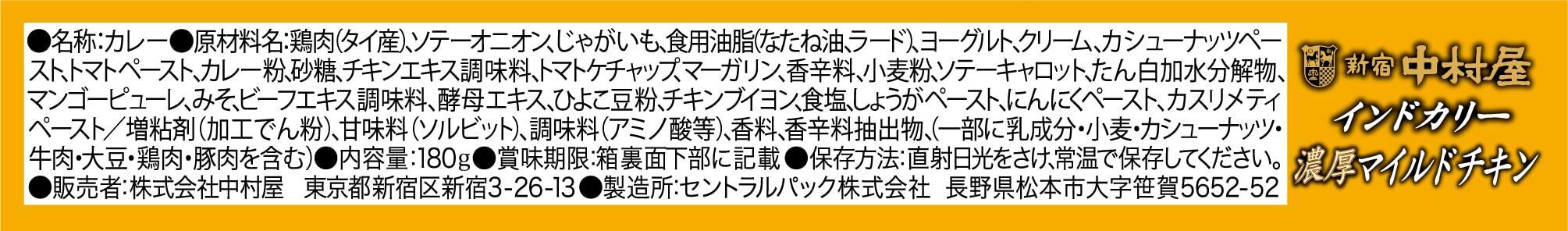 原材料:鶏肉、ソテーオニオン、野菜(じゃがいも、しょうが、にんにく)、食用油脂(なたね油、ラード)、ヨーグルト、クリーム、カシューナッツペースト、トマトペースト、カレー粉、砂糖、チキンエキス、トマトケチャップ、マーガリン、香辛料、小麦粉、ソテーキャロット、たん白加水分解物、マンゴーピューレ、みそ、ビーフエキス、酵母エキス、ベースン粉、チキンブイヨン、食塩、増粘剤(加工でん粉)、甘味料(ソルビット)、調味料(アミノ酸等)、香料、香辛料抽出物、(原材料の一部に豚肉を含む)