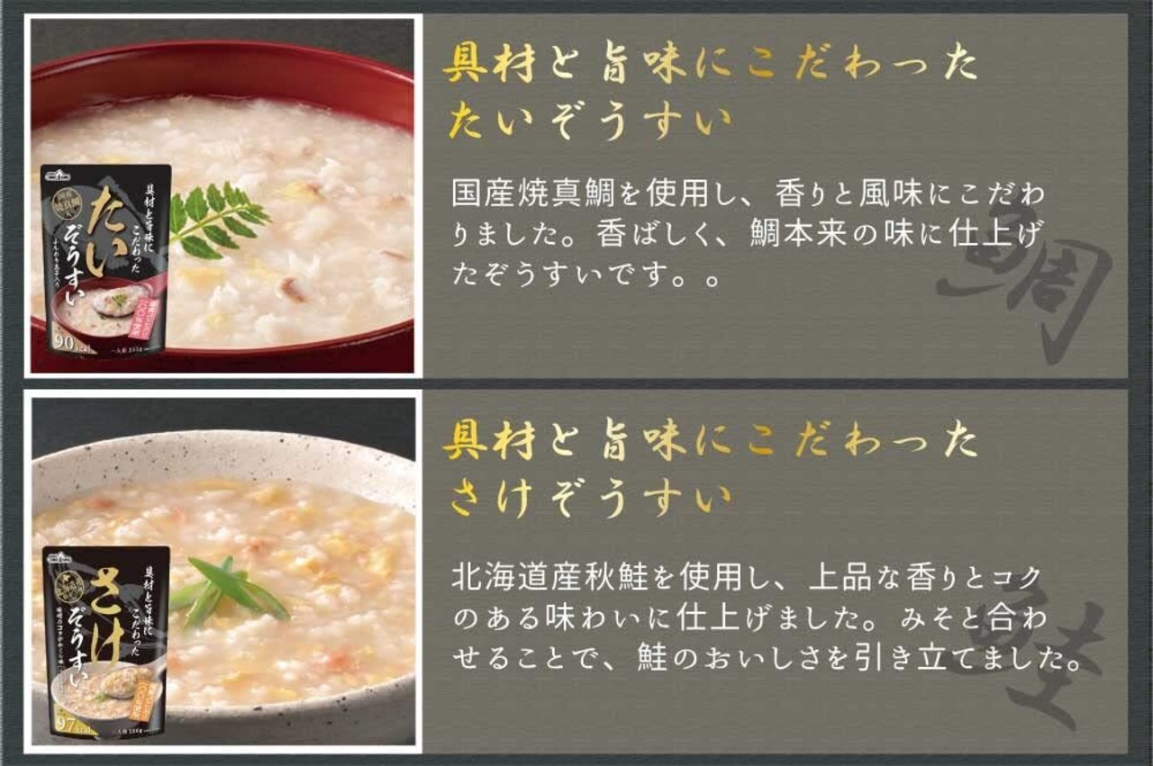 内容物:具材と旨味にこだわった たいぞうすい 250g2袋、さけぞうすい250g2袋、かにぞうすい250g2袋、ほたてぞうすい250g2袋、とりぞうすい250g2袋