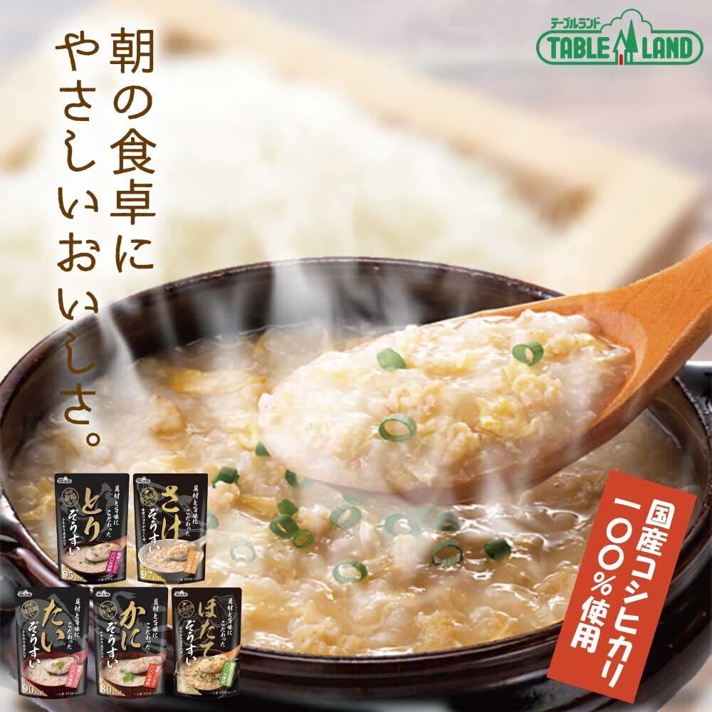 テーブルランド 具材と旨味にこだわった雑炊5種各2袋 内容物:具材と旨味にこだわった たいぞうすい 250g2袋、さけぞうすい250g2袋、かにぞうすい250g2袋、ほたてぞうすい250g2袋、とりぞうすい250g2袋 *隣の煎茶ティッシュセット