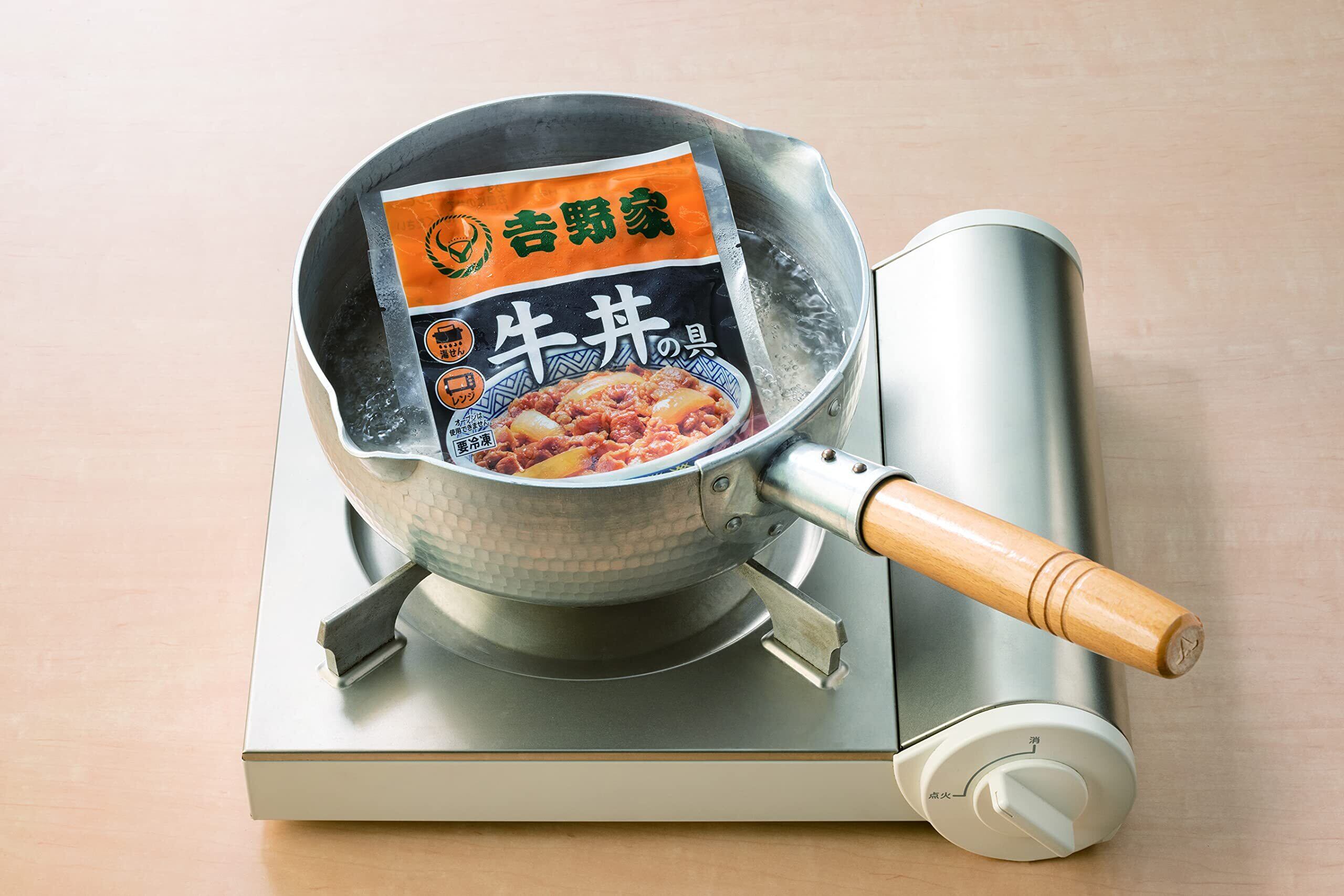 1. 凍ったままの牛丼の具を袋から出し、電子レンジまたは鍋で温めます。