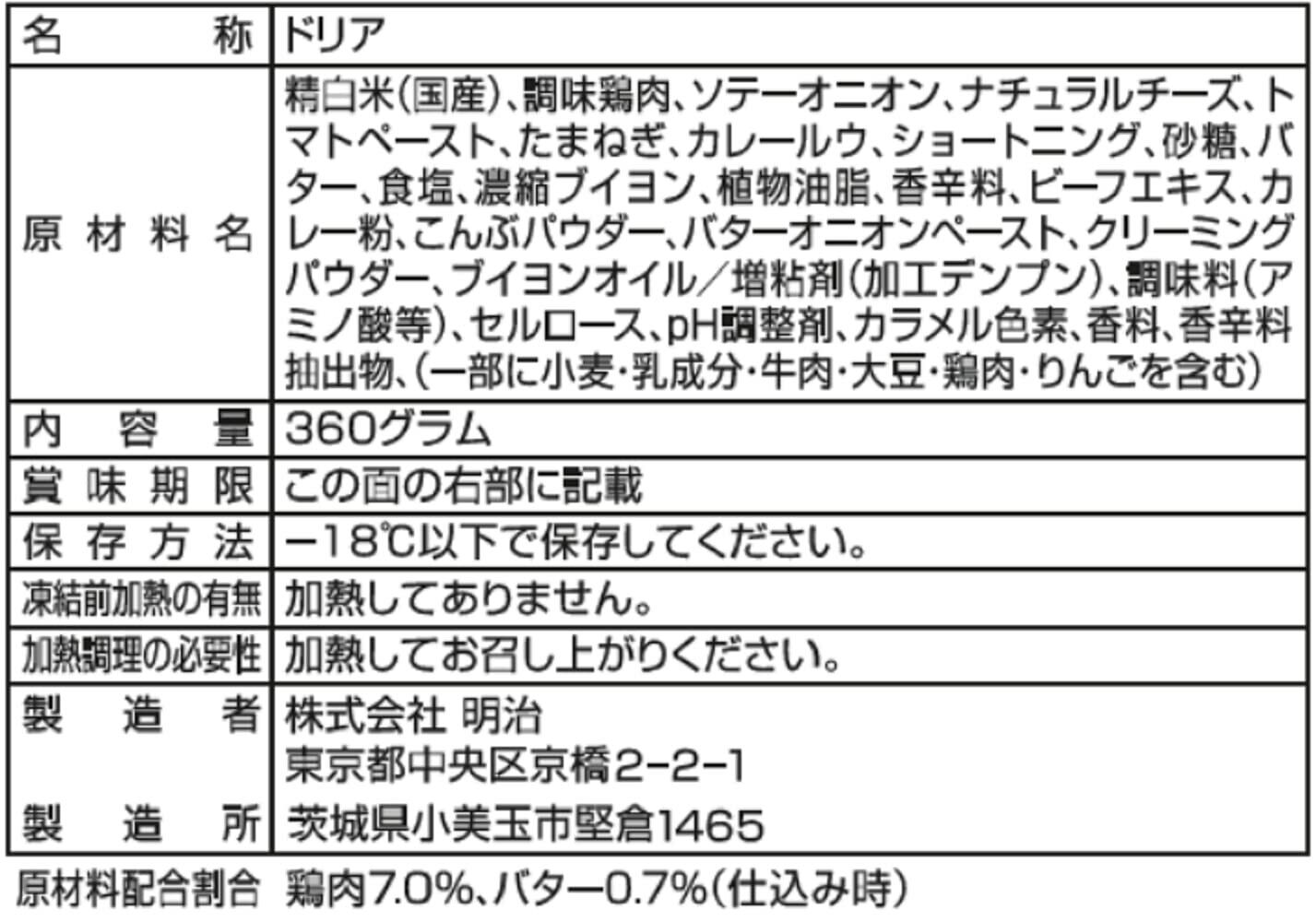 精白米(国産)、調味鶏肉、ソテーオニオン、ナチュラルチーズ、トマトペースト、たまねぎ、カレールウ、ショートニング、砂糖、バター、食塩、濃縮ブイヨン、植物油脂、香辛料、ビーフエキス、カレー粉、こんぶパウダー、バターオニオンペースト、クリーミングパウダー、ブイヨンオイル/増粘剤(加工デンプン)、調味料(アミノ酸等)、セルロース、pH調整剤、カラメル色素、香料、香辛料抽出物、(一部に小麦・乳成分・牛肉・大豆・鶏肉・りんごを含む)