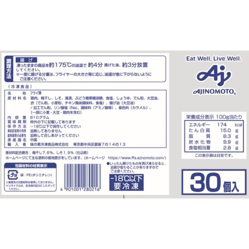 鶏肉、梅干し、しそ、清酒、ぶどう糖果糖液糖、食塩、しょうゆ、でん粉、大豆油、衣(でん粉、小麦粉、チキン風味調味料、食塩)、揚げ油(大豆油)/ 加工でん粉、リン酸塩(Na)、調味料(アミノ酸等)、着色料(カラメル)、(一部に小麦・大豆・鶏肉を含む)