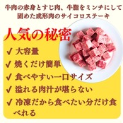 ●牛肉の赤身とすじ肉、牛脂をミンチにして固めた成型肉のサイコロステーキ。カット済みなので調理も簡単!一口サイズで柔らかく、お子様でも食べやすい大きさです。