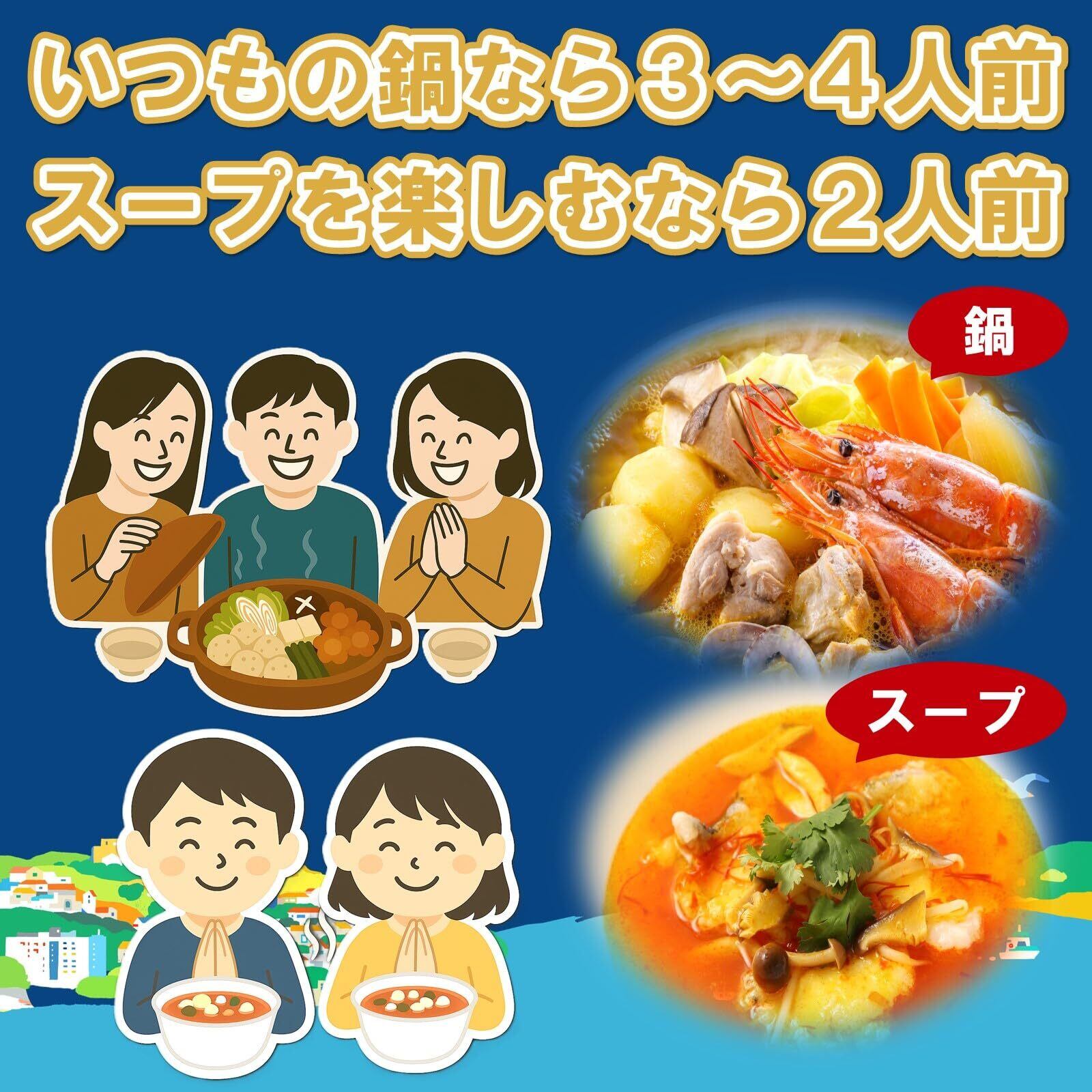 世界中の素敵な料理や食文化のエッセンスを鍋に取り入れた鍋スープ(鍋つゆ、鍋の素)シリーズです。フランスマルセイユ生まれの料理であるブイヤベースのエッセンスを取り入れた鍋スープです。魚介類のうま味がギュッとつまったスープに、オマール海老とサフランの風味がアクセントとなった味わいです。たっぷりスープを味わいたい人には2人前、いつもの鍋なら4人前です。