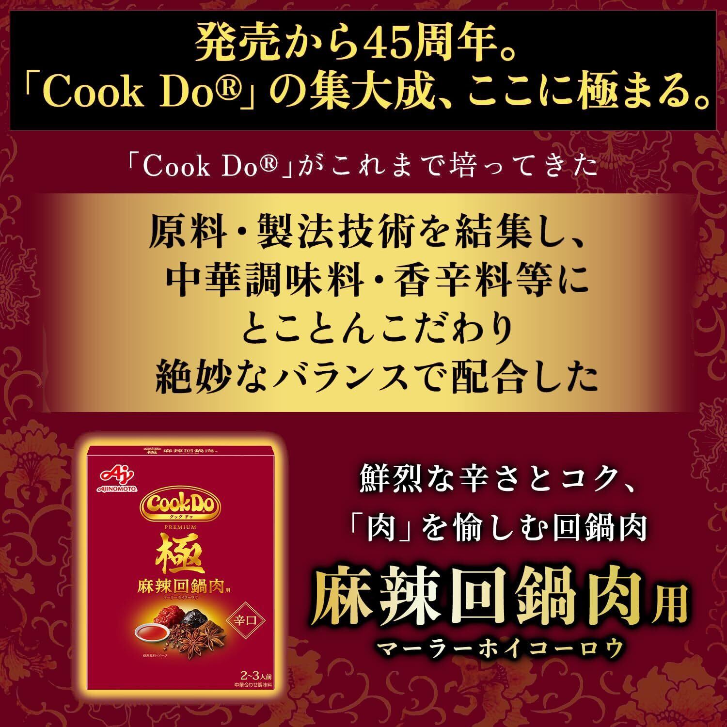 「CookDo 極 プレミアム 麻辣回鍋肉用」は、本格的な回鍋肉を家庭で手軽に楽しむための調味料です!特製の花椒油と熟成豆板醤を使用し、辛さと香りの調和が極めて美味しいひとときを演出します。友人や家族との食卓を、ぜひこの麻辣回鍋肉で特別なものにしてみてください!