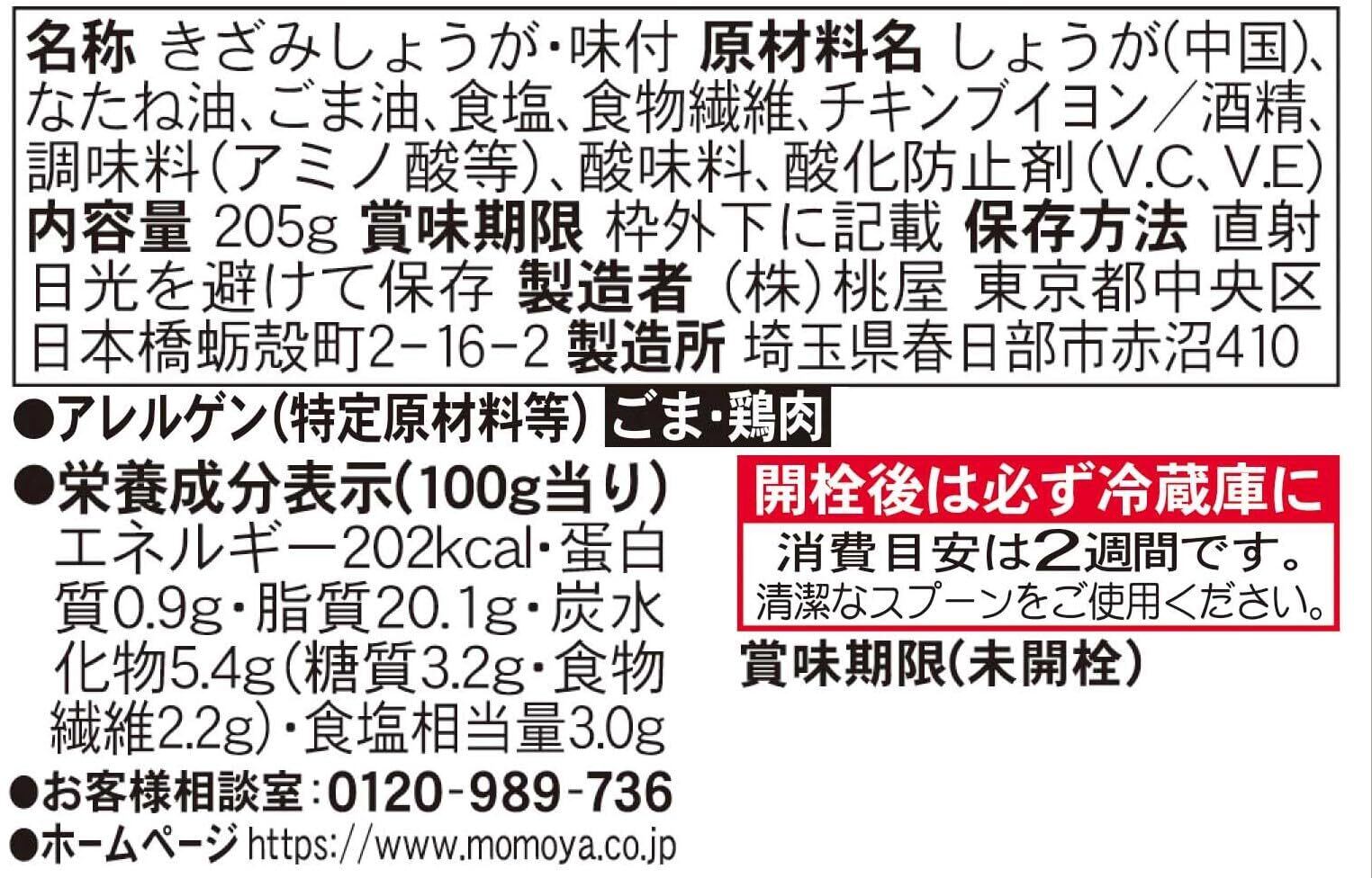 原材料名:しょうが(中国)、なたね油、ごま油、食塩、食物繊維、チキンブイヨン/ 酒精、調味料(アミノ酸等)、酸味料、酸化防止剤(V.C、V.E)