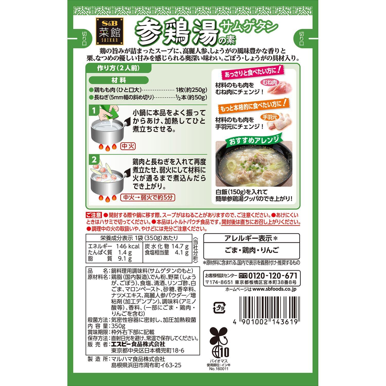 「S&B 菜館 参鶏湯の素」は、自宅で手軽に本格的な韓国料理の代表、参鶏湯を楽しめる調味料です!厳選した素材を使用し、豊かな旨味が詰まったこの素は、食材と合わせるだけで、美味しいスープが簡単に完成します。特別な日や家族との食事にぴったりの一品です。