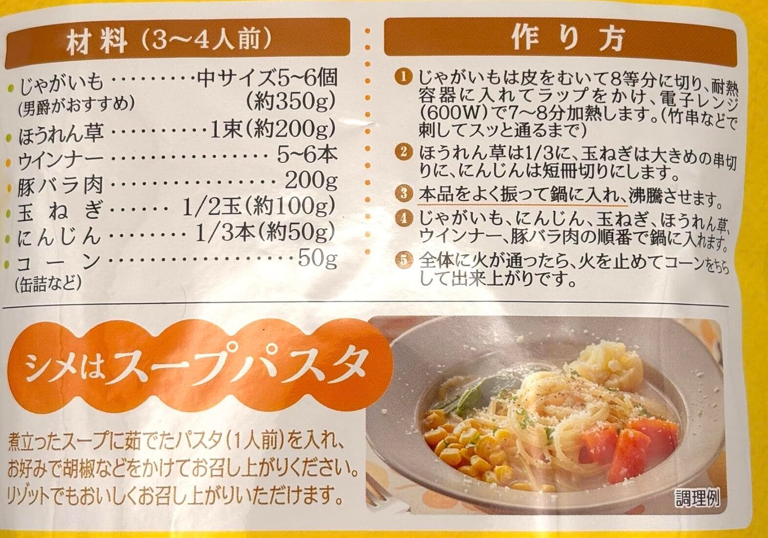 作り方(3〜4人前) ● じゃがいもは皮をむき、8等分に切る。耐熱容器に入れてラップをかけ、電子レンジ(600W)で7〜8分加熱。(竹串がスッと通るまで) ● ほうれん草は1/3に切り、玉ねぎは大きめの串切り、にんじんは短冊切りにする。 ● 本品をよく振って鍋に入れ、沸騰させる。 ● じゃがいも・にんじん・玉ねぎ・ほうれん草・ウィンナー・豚バラ肉の順に鍋へ入れる。 ● 全体に火が通ったら火を止め、コーンを加えて完成。