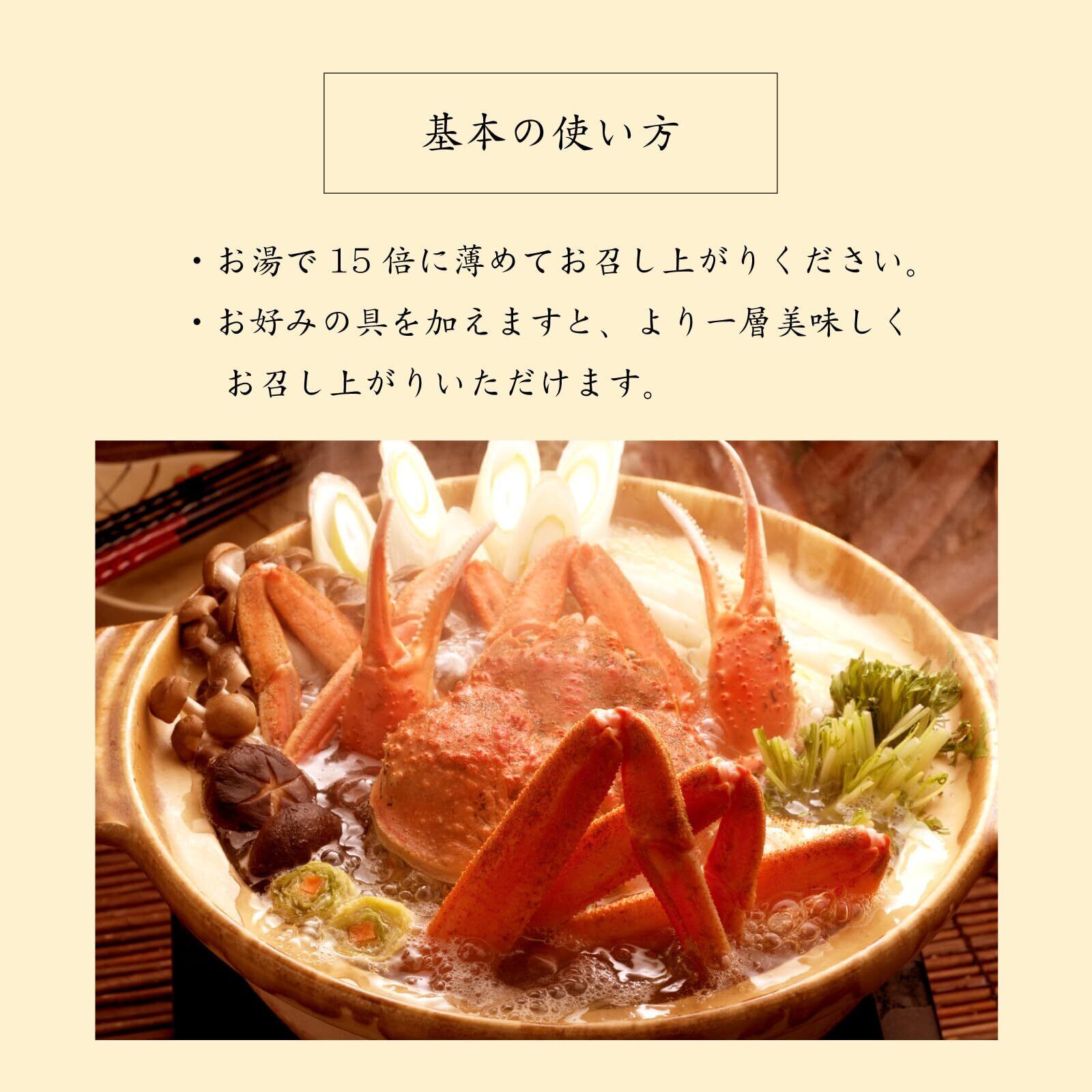 濃厚なかにの旨みがぎゅっとつまった万能調味料。 かにを含む魚介のエキスを配合した濃縮タイプのかに汁の素です。濃縮な”かにエキス”に黒酢と鰹・昆布エキスを加え、醤油の香り豊かなスープベースに仕上げました。 お好みの具を加えますと、より一層美味しくお召し上がりいただけます。また、味噌汁やお料理の隠し味として深みのあるかに汁の香りをお楽しみください。 (お湯で約15倍に薄めてお召し上がりください。開封後は冷蔵庫(10℃以下)で保存し、なるべく早めにお召し上がりください。)
