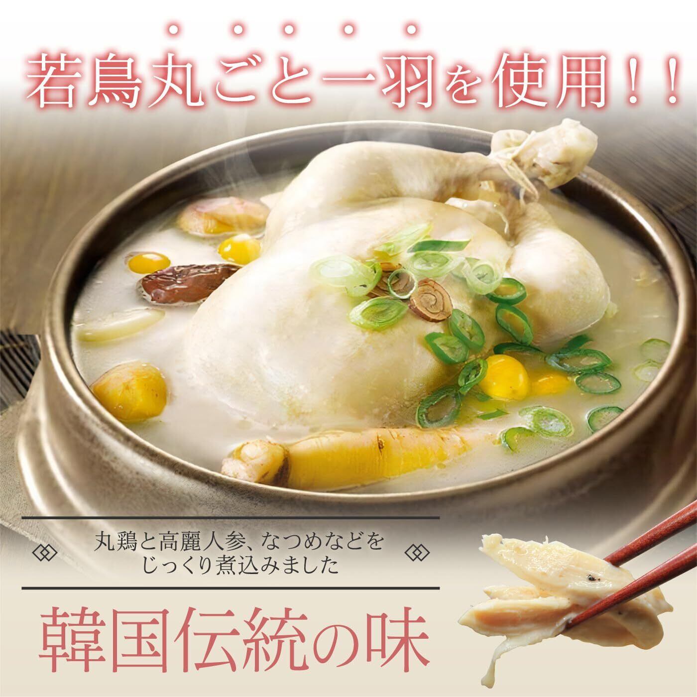 【参鶏湯】鶏肉、もち米、うるち米、栗、高麗人参、にんにく、食塩、なつめ、牛肉だしの素/調味料(アミノ酸)、pH調整剤、香料、乳化剤、カラメル色素、増粘剤(キサンタンガム)、(一部に小麦・乳成分・牛肉・大豆・鶏肉を含む)