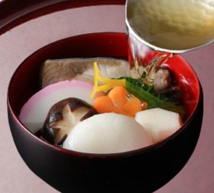 長崎県産あご(飛び魚)のだしを使用し、上品で澄んだ味わいに仕上げた「お雑煮のつゆ」。 九州ならではの“あごだし”の香りと旨みが広がる、まろやかで奥深い味わいが特徴です。