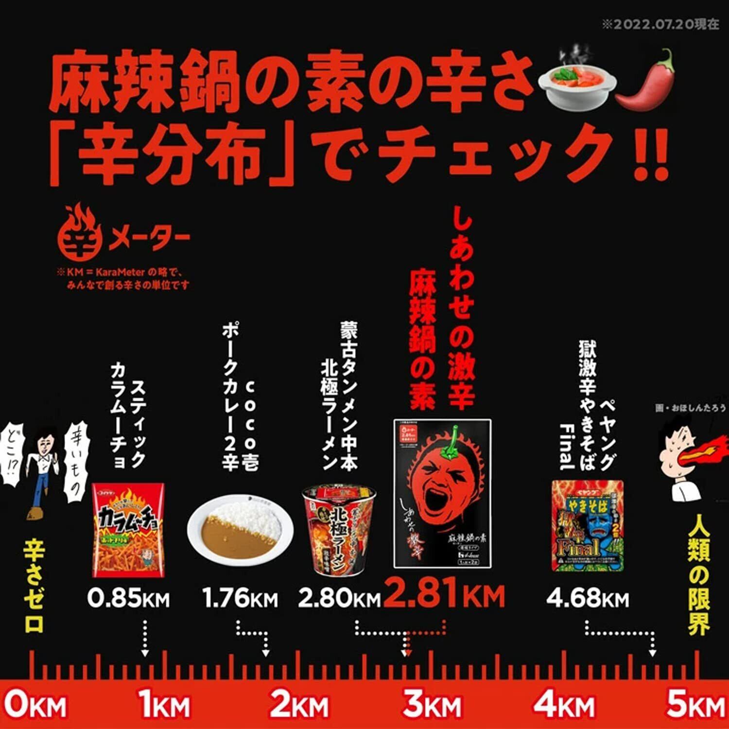 ◆しあわせの激辛とは? ・ブランドコンセプトは、“大人のココロを元気にする「達成感」「幸福感」を提供する""。 ・「旨さ」と「辛さ」が両立した“質の良い激辛""を目指した新しい「激辛」シリーズ。 ・ただ辛いだけでなく、美味しさが伴った激辛メニューなので、激辛ファンの方だけでなく、激辛ライト層の方にもオススメ。 ・日々ストレス社会で戦うあなた、辛いものを食べてスカッとしませんか? ◆激辛麻辣鍋の素の特徴 ・製品コンセプトは、“メニューとしての美味しさと複雑で強烈な辛さが両立された「旨・激辛食」なので、辛みだけではない、 メニューとしての美味しさを伴った激辛料理を楽しむことができる""。 ・「豆味噌の旨みと花椒のビリビリするしびれ」と「異なる辛さの特徴を持つ4種の唐辛子を組み合わせた染み渡る辛さ」が両立した激辛麻辣鍋の素。 ・味の違う4種の唐辛子を組み合わせることで、辛さ<辣>を演出し、花椒でビリビリする痺れ<麻>を付与しました。青花椒油を入れ、さわやかな香りも付与。 ・豆板醤、豆味噌、ガーリックエキス、醤油で旨さを付与し、更に、真っ赤なオイルを浮かせ、中華料理には欠かせないスターアニス(八角)の風味も効かせた四川風の麻辣鍋つゆ。 ・辛さは「辛味順位」では表記できない、ハウス食品史上最も辛いレベル。 ◆『辛メーター』とのタイアップ ・本シリーズの開発にあたり、激辛ファンが集まるSNSコミュニティ『辛メーター』とのタイアップを実施。 ・辛メーターが独自に開発した辛さ単位「KM値(辛メーター値)」を辛さレベル表記として採用。 ・本製品のKM値は「2.93KM」。 ◆激辛ファンのお墨付き ・辛メーターに紹介いただいた激辛ファンの方々に実際に試食いただき、“辛さレベル""“辛さ""と美味しさの両立""について評価いただいた味わい。