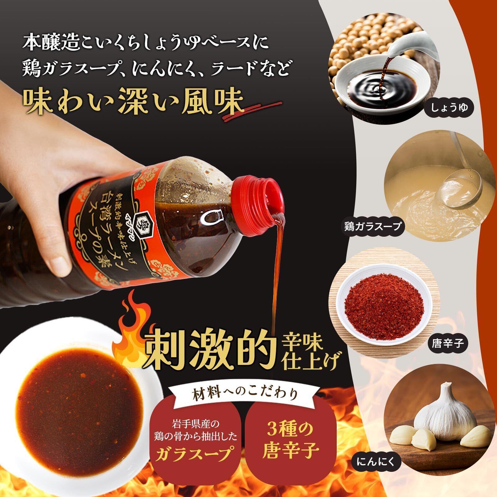 【3種類の唐辛子を使用した本格台湾ラーメン】本醸造こいくちしょうゆをベースに、岩手県産の鶏の骨から抽出したガラスープ、にんにく、ラードを加えて味わい深く仕上げました。3種類の唐辛子による刺激的な辛味が特徴です。必要な工程はお湯で割るだけ!お手軽に本格的な台湾ラーメンが楽しめます。