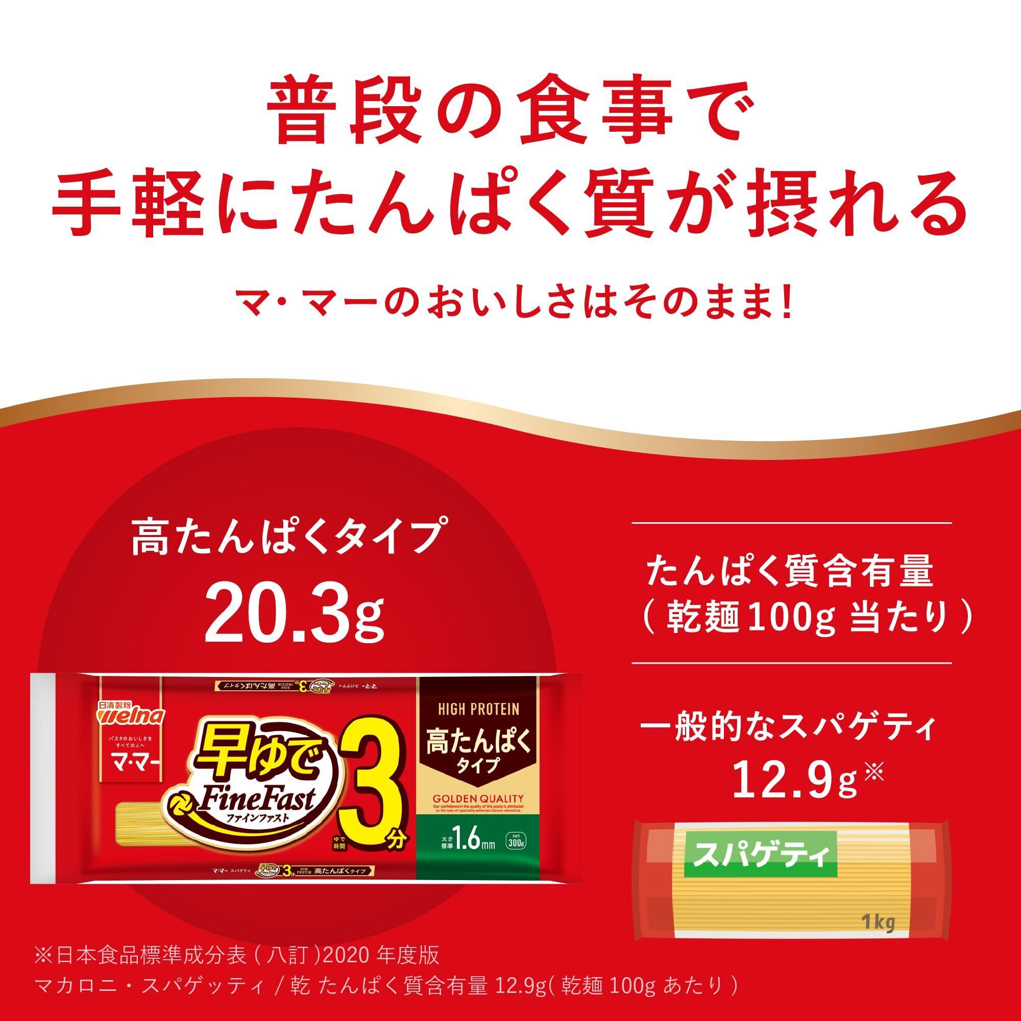 「マ・マー早ゆでスパゲティ」から高たんぱくタイプのスパゲティが登場。早ゆでタイプだからゆで時間3分で手早くゆであがります。