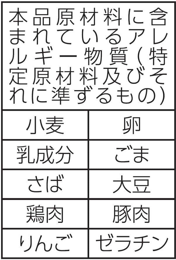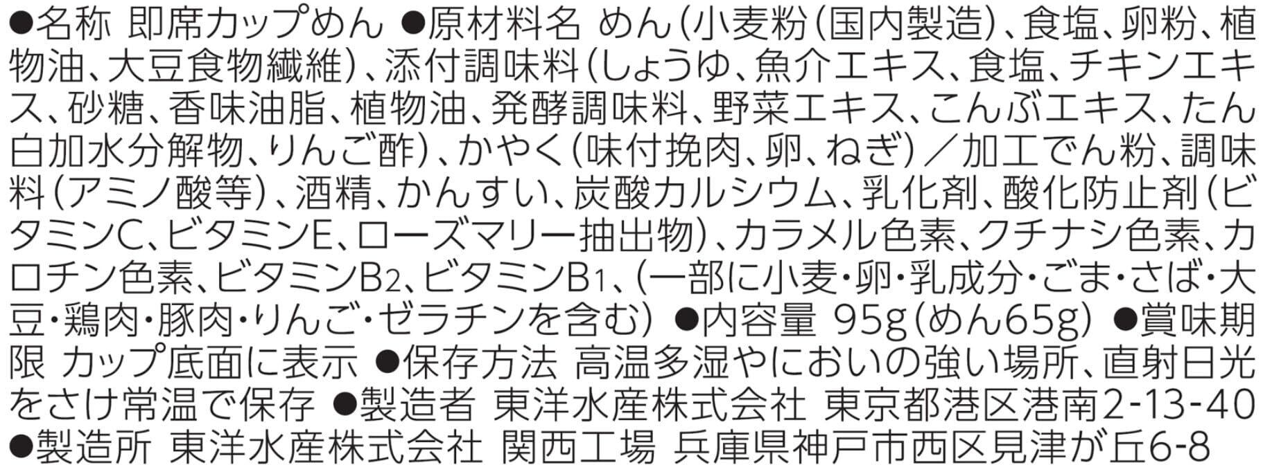 めん(小麦粉(国内製造)、食塩、卵粉、植物油、大豆食物繊維)、添付調味料(しょうゆ、魚介エキス、食塩、チキンエキス、砂糖、香味油脂、植物油、発酵調味料、野菜エキス、こんぶエキス、たん白加水分解物、りんご酢)、かやく(味付挽肉、卵、ねぎ)/加工でん粉、調味料(アミノ酸等)、酒精、かんすい、炭酸カルシウム、乳化剤、酸化防止剤(ビタミンC、ビタミンE、ローズマリー抽出物)、カラメル色素、クチナシ色素、カロチン色素、ビタミンB2、ビタミンB1、(一部に小麦・卵・乳成分・ごま・さば・大豆・鶏肉・豚肉・りんご・ゼラチンを含む)