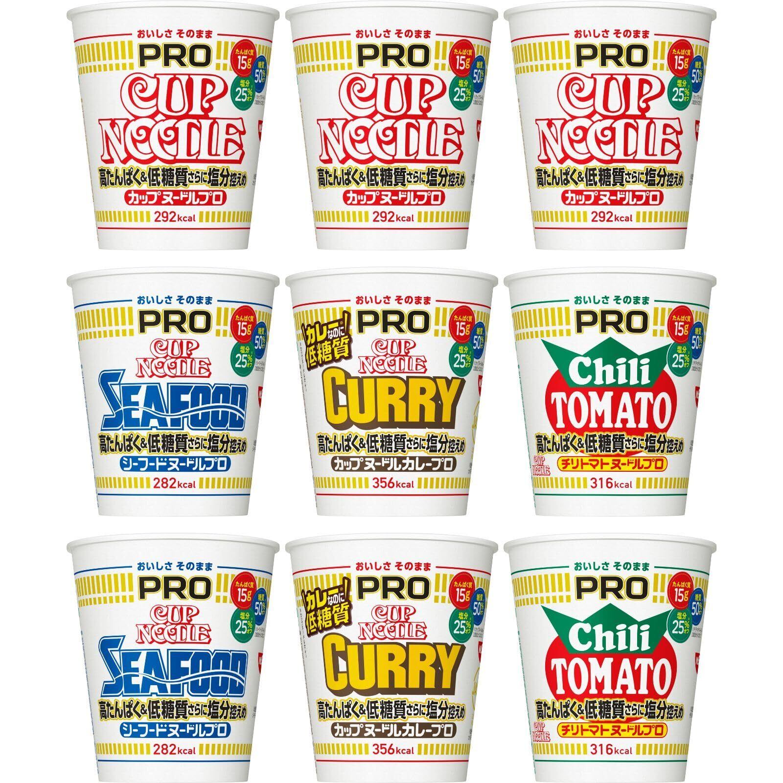 カップヌードルPROシリーズで新登場のカレー味が入った4種計9食セット。新登場のカレー味は、高たんぱく&低糖質さらに塩分控えめカプヌ たんぱく15g、糖質50%オフ、さらに通常品と比較して塩分25%カットなのに"おいしさそのまま"。