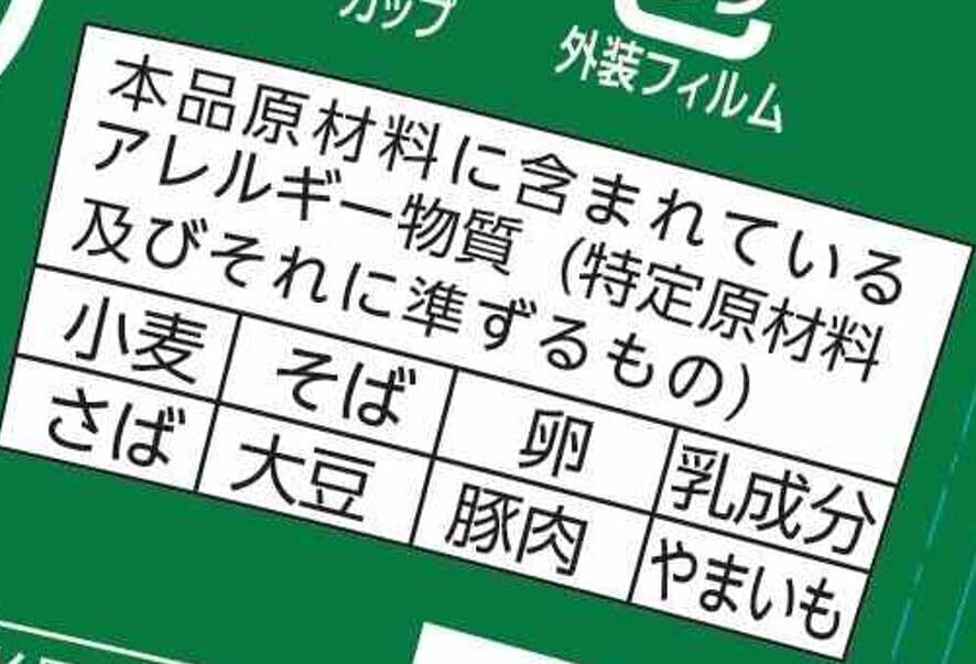 油揚げめん(小麦粉(国内製造)、そば粉、植物油脂、植物性たん白、食塩、とろろ芋)、添付調味料(食塩、糖類、魚介エキス、植物油脂、しょうゆ、しいたけエキス、こんぶエキス、香味油脂、香辛料)、かやく(味付油揚げ、卵、ねぎ)/加工でん粉、調味料(アミノ酸等)、リン酸塩(Na)、炭酸カルシウム、カラメル色素、増粘多糖類、乳化剤、酸化防止剤(ビタミンE)、香料、ビタミンB2、ビタミンB1、香辛料抽出物、(一部に小麦・そば・卵・乳成分・さば・大豆・豚肉・やまいもを含む)