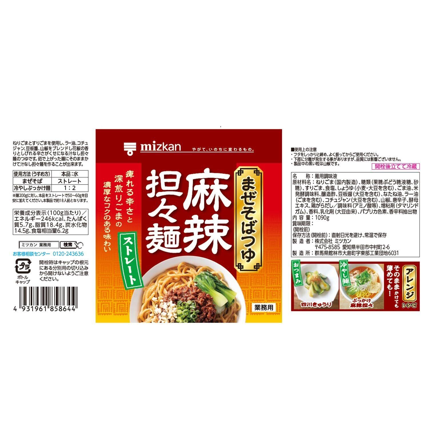 「ミツカン まぜそばつゆ 麻辣 担々麺」は、スパイシーな麻辣風味を楽しめる特製つゆです!1090gの業務用サイズで、大人数にも対応可能なボリューム感が魅力です。コク深い担々麺の風味をそのまま再現しており、あっという間に本格的なまぜそばを楽しむことができます。