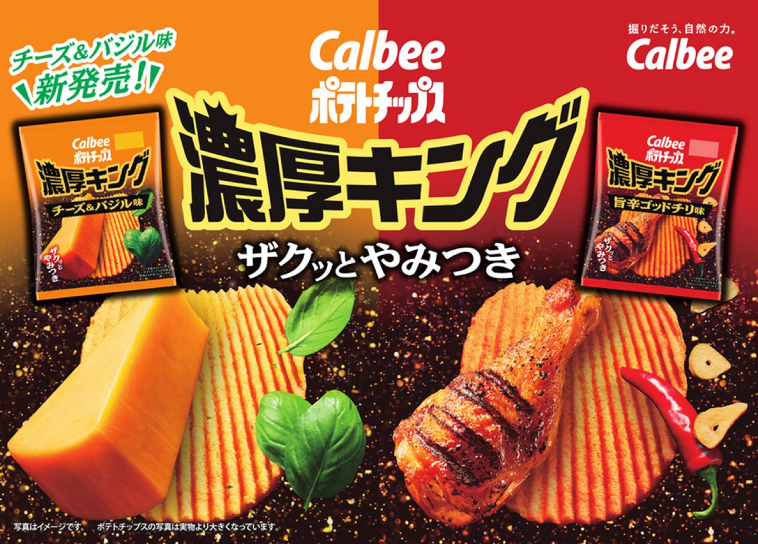 「カルビー ポテトチップス濃厚キングチーズ&バジル味」をぜひお試しください!濃厚な風味と楽しい食感が詰まった新しいスナック体験をお届けします。
