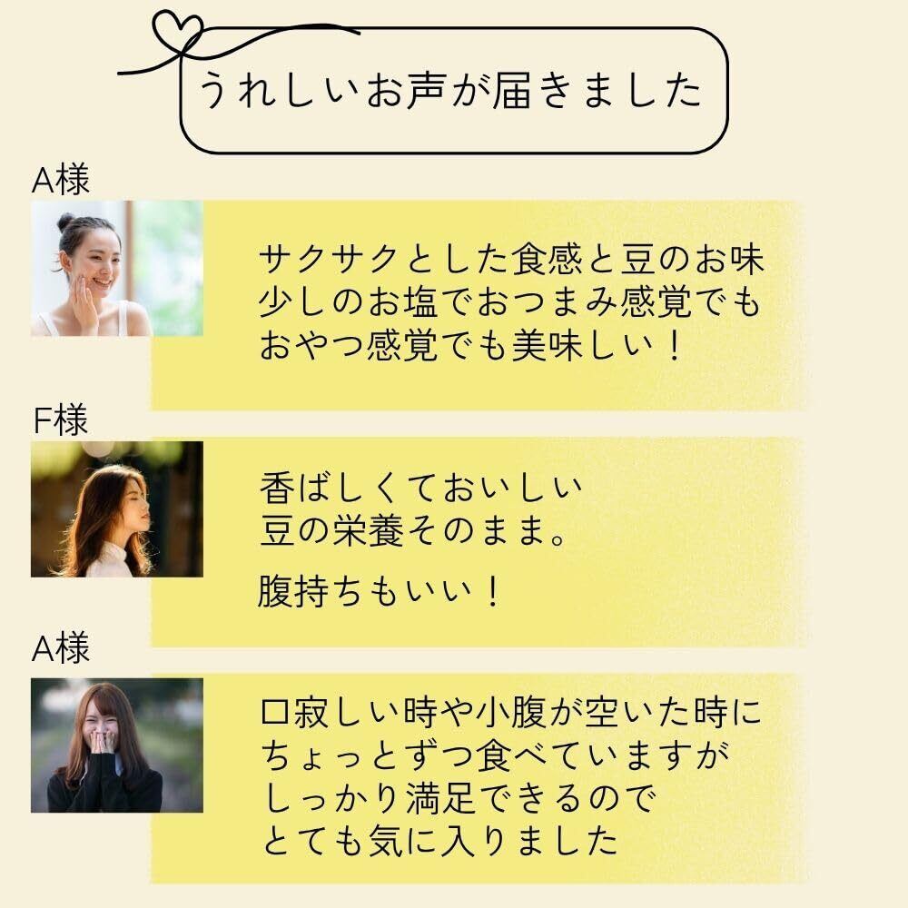 「豆の風味を丸ごと感じてもらいたい」 そんな想いから、余計なものや、つなぎとなる原料は使っておりません。 また、硬いイメージのお豆を、パリッとした食感で楽しんでいただきたいので、あえて薄く仕上げております そのため、なるべく割れない様に包装内にトレーをいれておりますが、多少割れてしまう場合もあります。 小さなものも、お味に変わりはございませんので、サラダやスープにぱらっとかけていただいても、また違う美味しさが楽しめますぜひ、最後までご堪能下さい