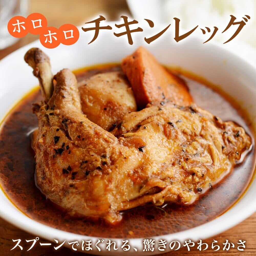 商品説明:チキンレッグを丸ごと、箸でもほぐれるほど柔らかく煮込んだ、北国オリジナルのスープカレーです!お好みでゆで卵やレンコン、パプリカや季節の野菜などをトッピングしても美味しくいただけます。