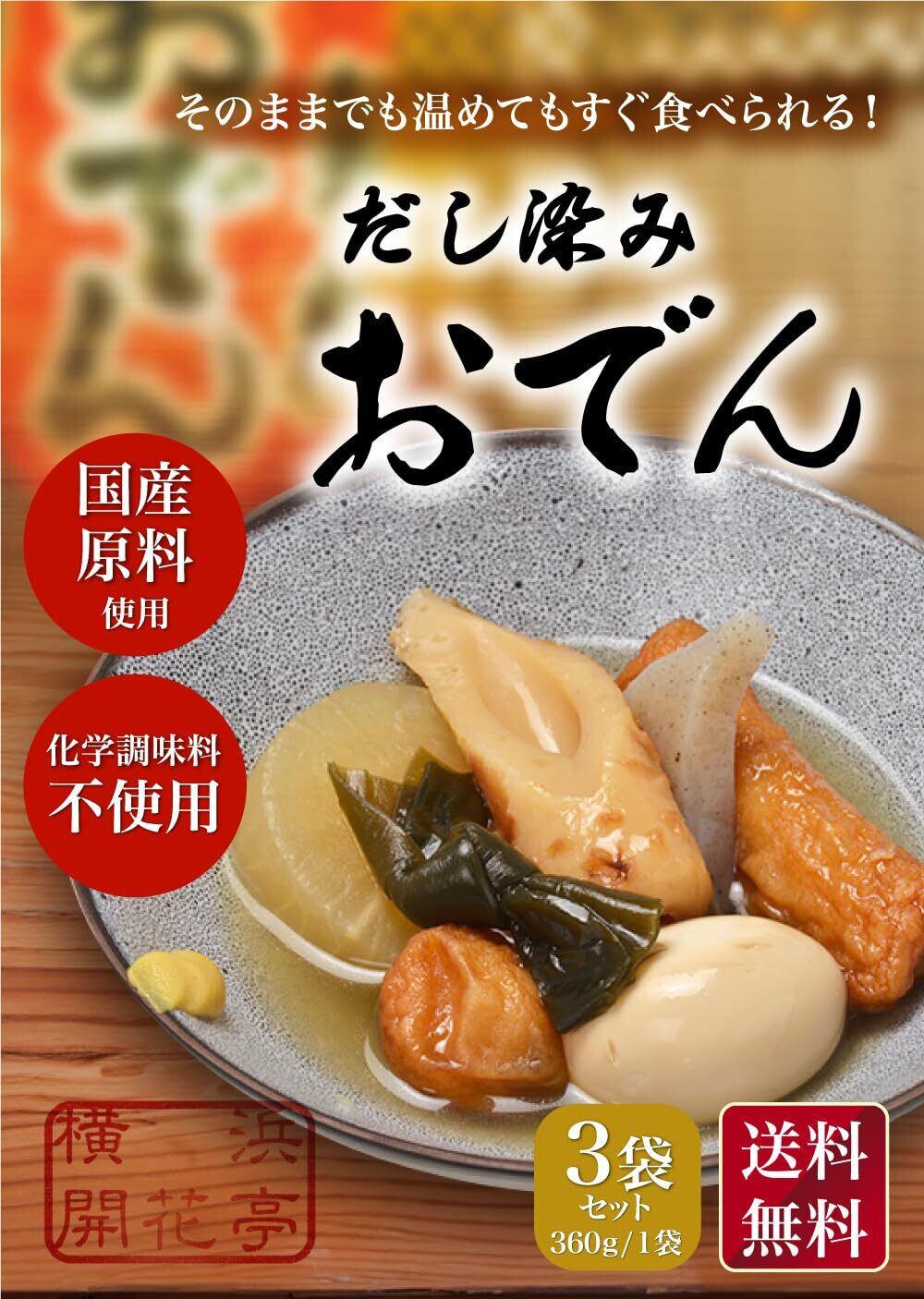 「おでん レトルト だし染みおでん」は、横浜開花亭から届く本格的なおでんのセットです!手軽に楽しめるレトルトパウチタイプで、360g入りが3袋セットになっており、ご家族や友人と一緒においしいおでんを囲むことができます。