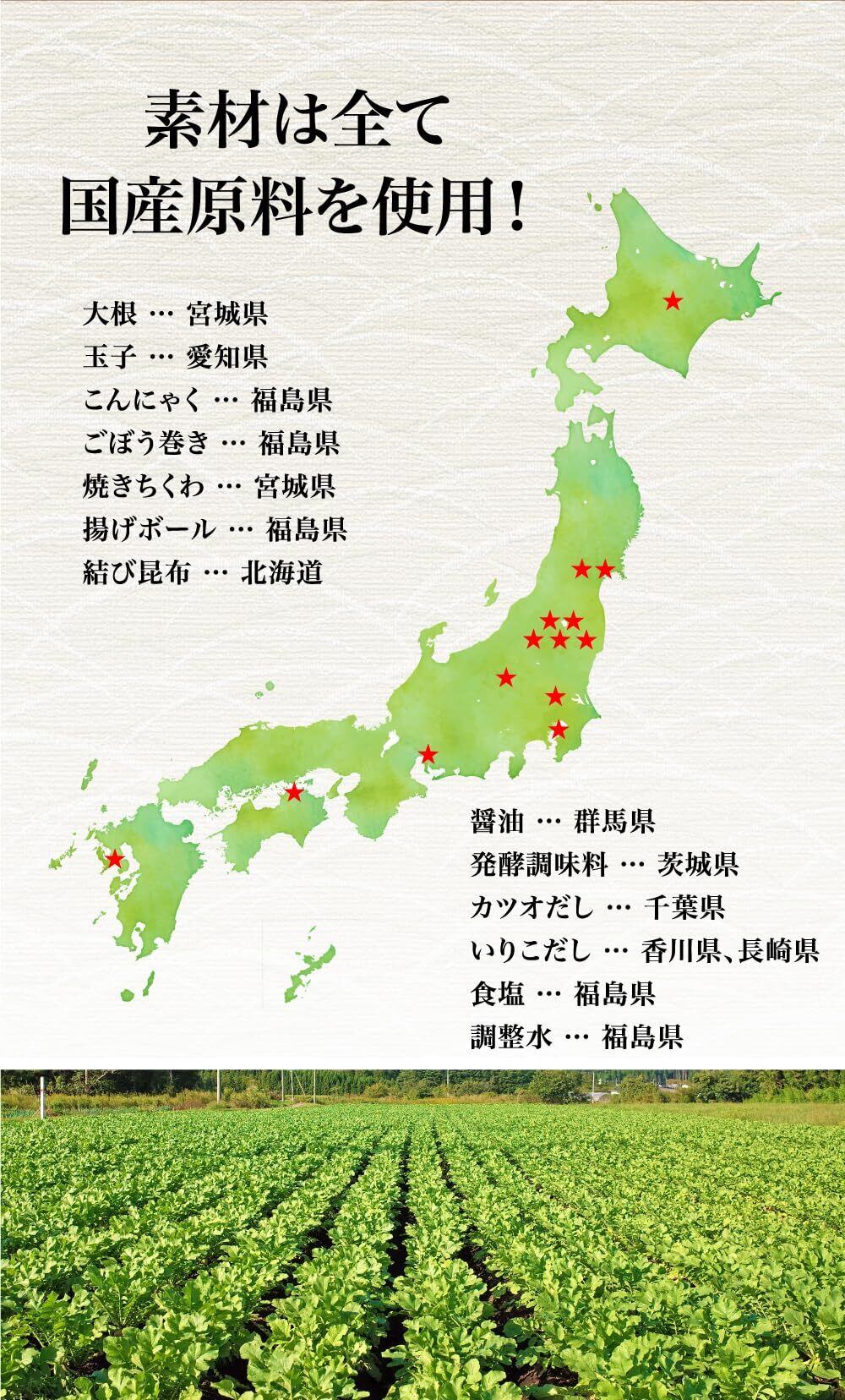 大根(国産)、玉子、ごぼう巻き、こんにゃく、竹輪、揚げボール、醤油、発酵調味料、昆布、水飴、砂糖、食塩、魚介エキス(昆布、かつお節、ほたて、いりこ)酵母エキス/水酸化Ca(一部に卵、小麦、大豆を含む)