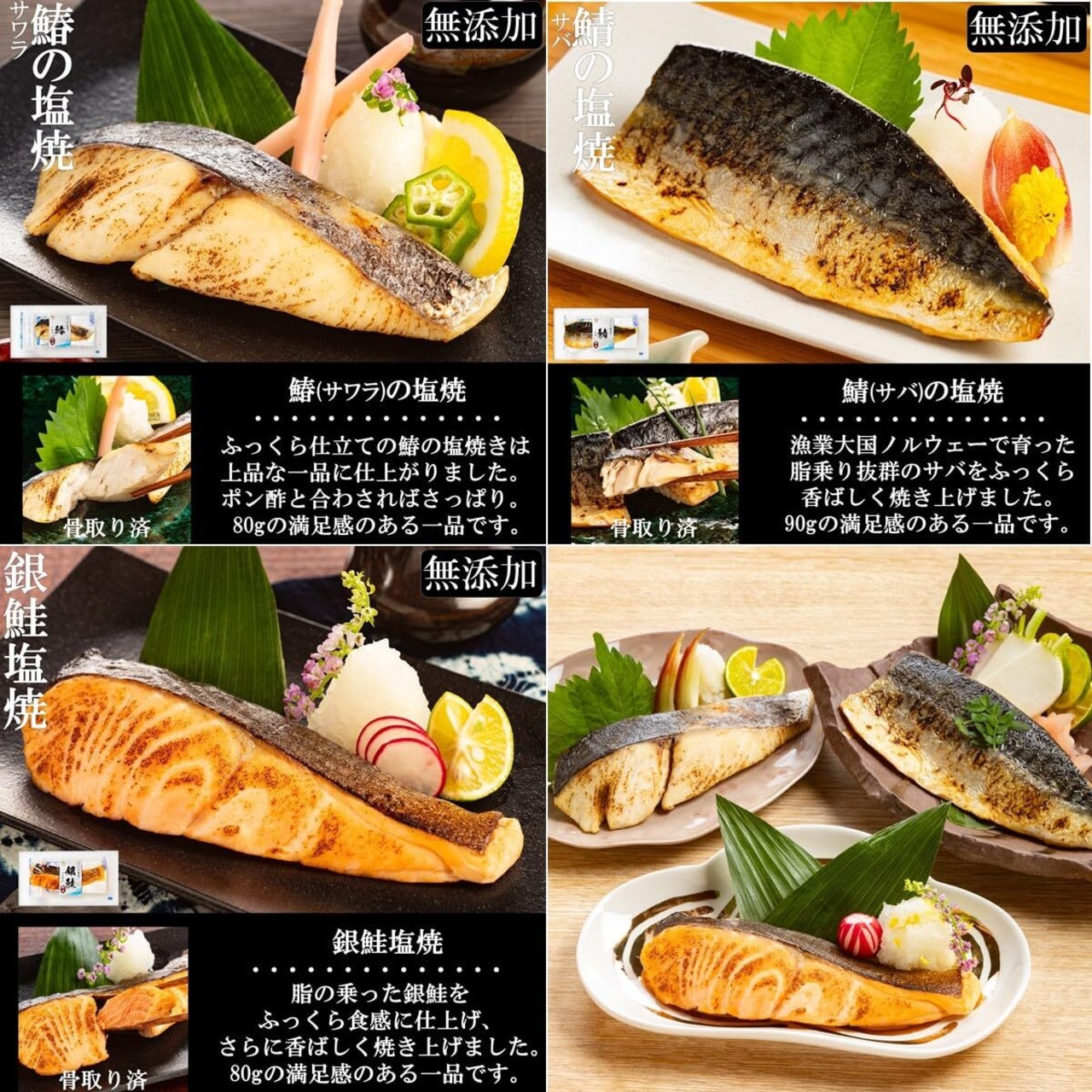 ■内容量:・とろ鯖煮付け(95g) ・鮭の西京焼(80g) ・鮭の照焼(100g) ・鯖の塩焼き(90g) ・銀鮭塩焼き(80g) ・鰆の塩焼き(80g) 6種各2個ずつ 合計12個