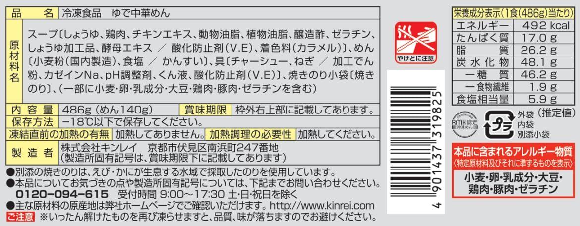 スープ〔しょうゆ、鶏肉、チキンエキス、動物油脂、植物油脂、醸造酢、ゼラチン、しょうゆ加工品、酵母エキス / 酸化防止剤(V.E)、着色料(カラメル)〕、めん〔小麦粉(国内製造)、食塩 / かんすい〕、具〔チャーシュー、ねぎ / 加工でん粉、カゼインNa、pH調整剤、くん液、酸化防止剤(V.E)〕、焼きのり小袋〔焼きのり〕、(一部に小麦・卵・乳成分・大豆・鶏肉・豚肉・ゼラチンを含む)
