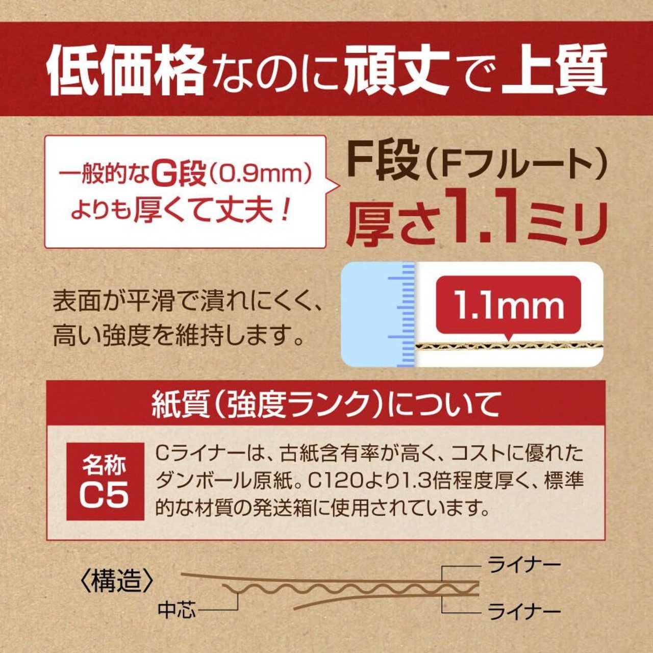 ●クリックポスト・ゆうパケット・定形外郵便などに対応したA5サイズで厚さ2.9cmのメール便N式ケース。 形状は、蓋を手前に差し込むタイプのN式。組み立て作業が簡単で、梱包の際のテープ留めもヤッコ型に比べて作業性が良く、梱包時間の削減にもつながります。