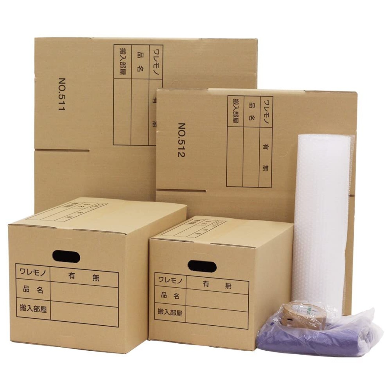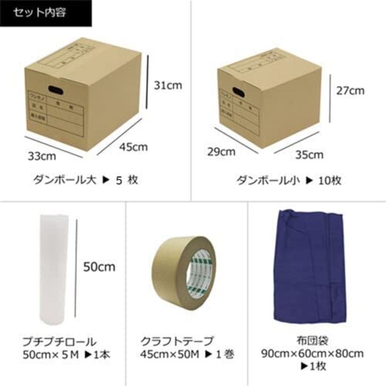 ロジマート ダンボール 引っ越し セットS 1~2人用 【布団袋付き】 段ボール箱(大5枚・小10枚) プチプチロール クラフトテープ (1~2人用)