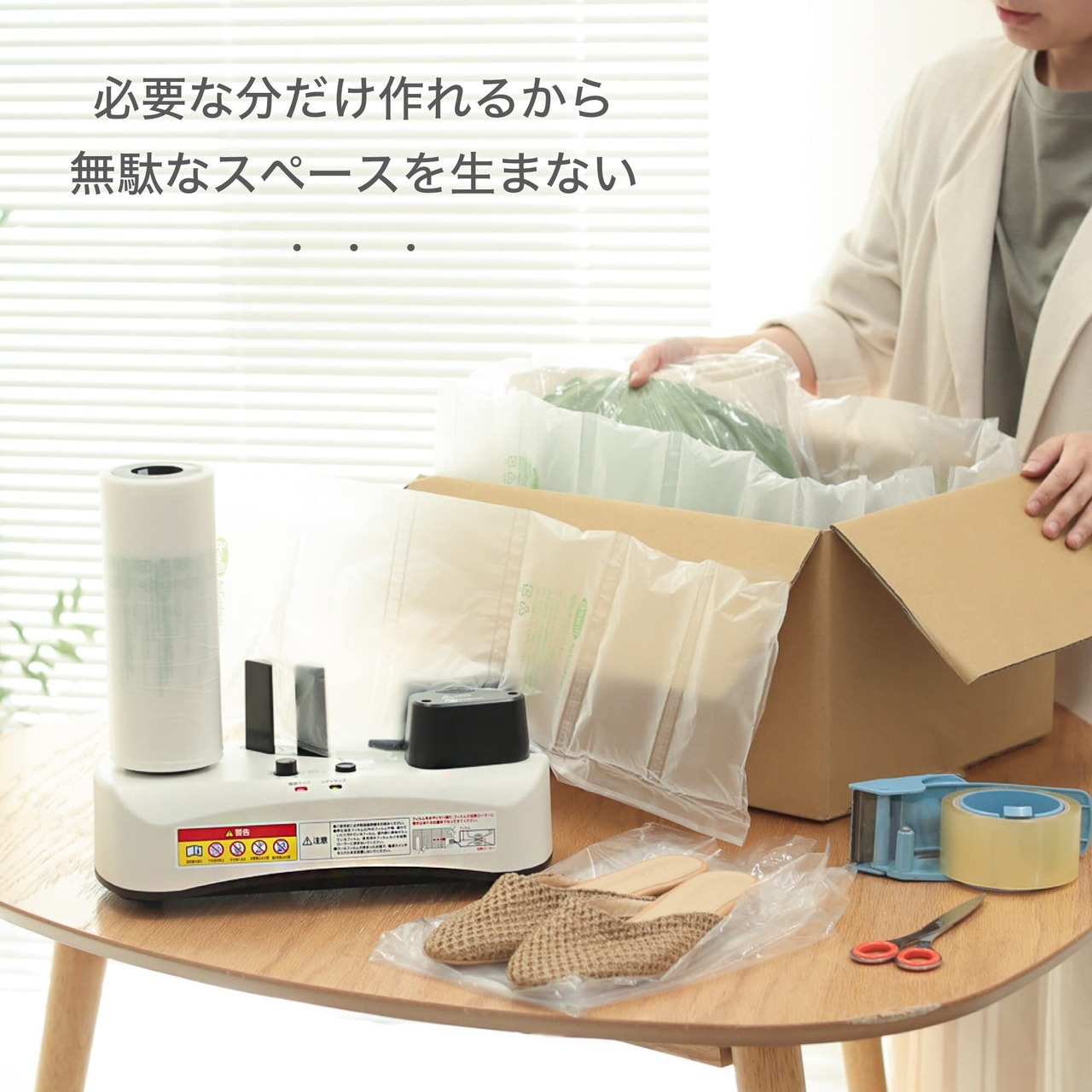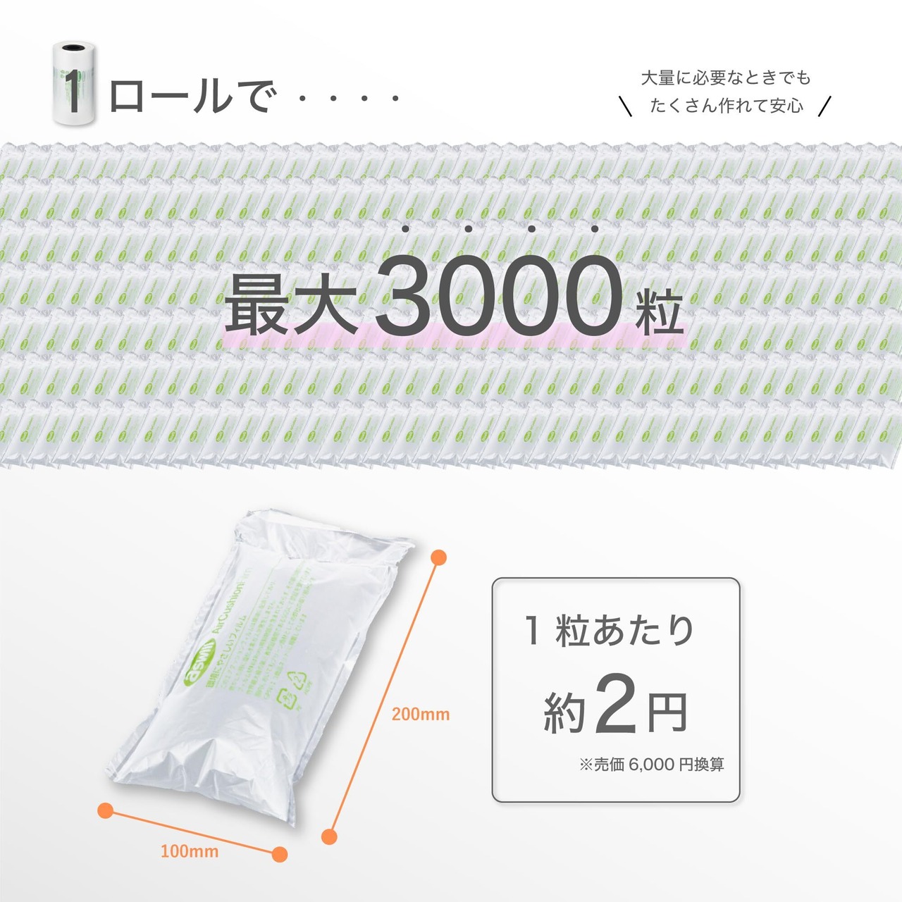 エアークッション(ピロータイプ)1粒サイズが100×200mm。ロールフィルム200Mで最大2000粒作成可能。1粒当たりのコストを低減します。
