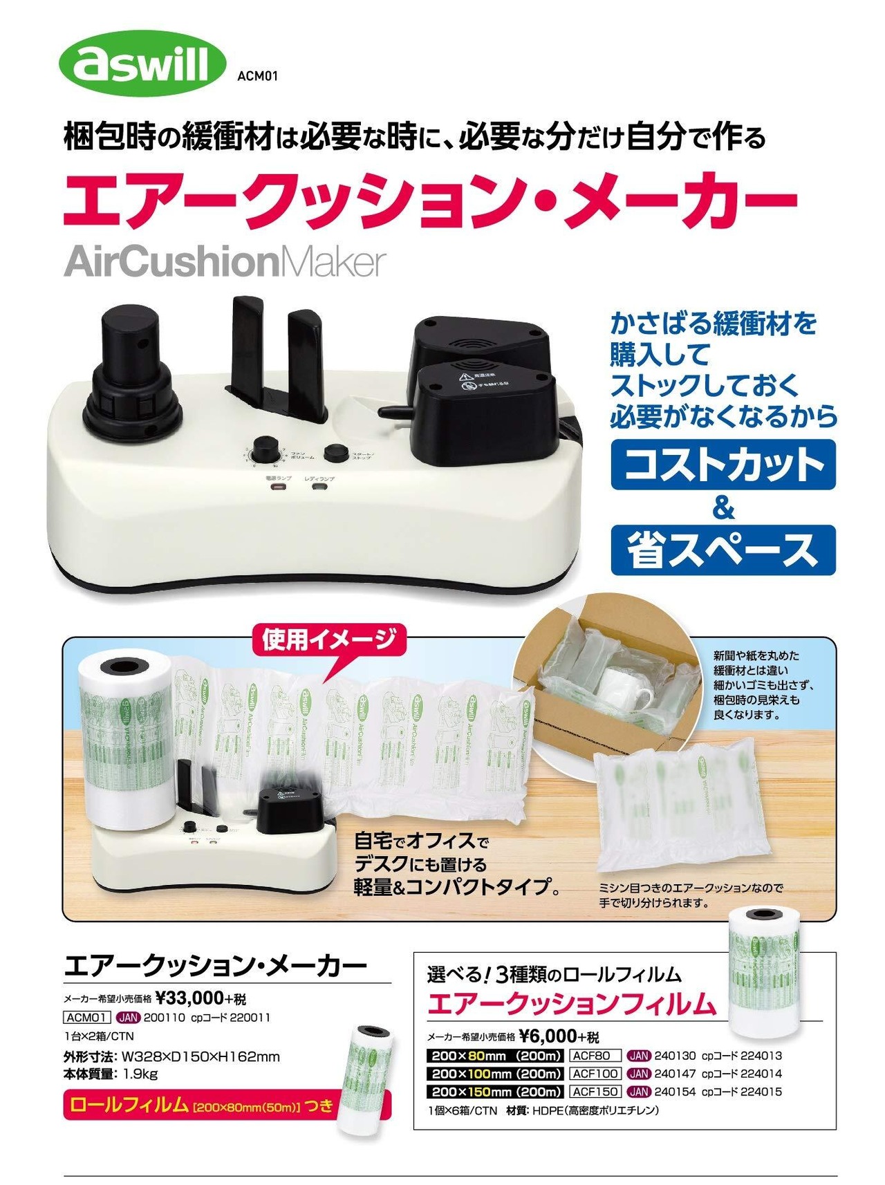 aswilの製エアクッションフィルムは市販のバラタイプのエアクッションに比べて保管スペースをとりません。同サイズの空気入りのバラ品600粒とACF100のロール1巻を空間消費量で比較すると100分の1となります(理論値)。空間を有効活用に貢献します。